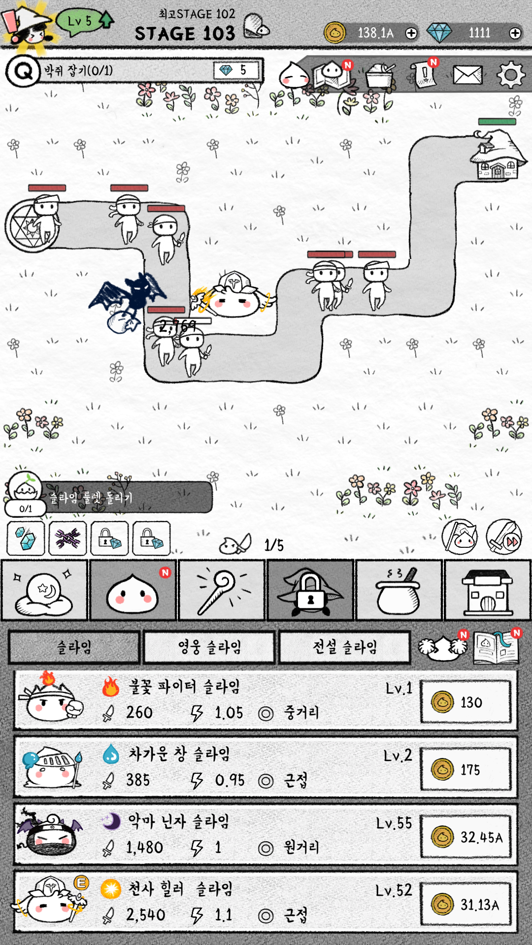 한 번에 업그레이드를 하면 웨이브를 막을 수 없으니 일단 적당히 강한 슬라임을 합성하지 않고 모으면서 진행했습니다.