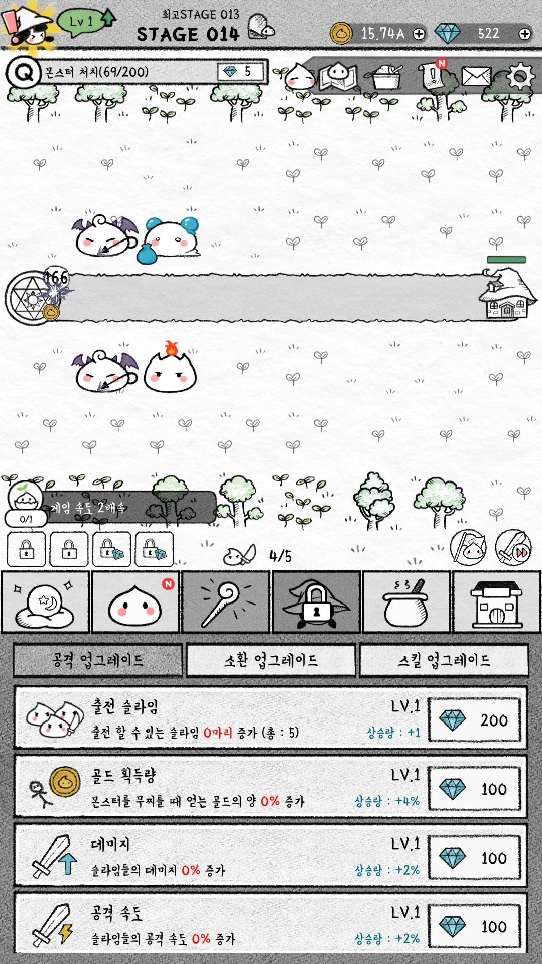 다음 탭은 다이아를 소모해서 공격, 소환, 스킬을 업그레이드할 수 있습니다. 여기서 다이아로 자동 소환과 자동 합성의 시간도 빠르게 할 수 있는데 완전 자동으로 하려면 결국 다이아가 많이 필요하겠네요.