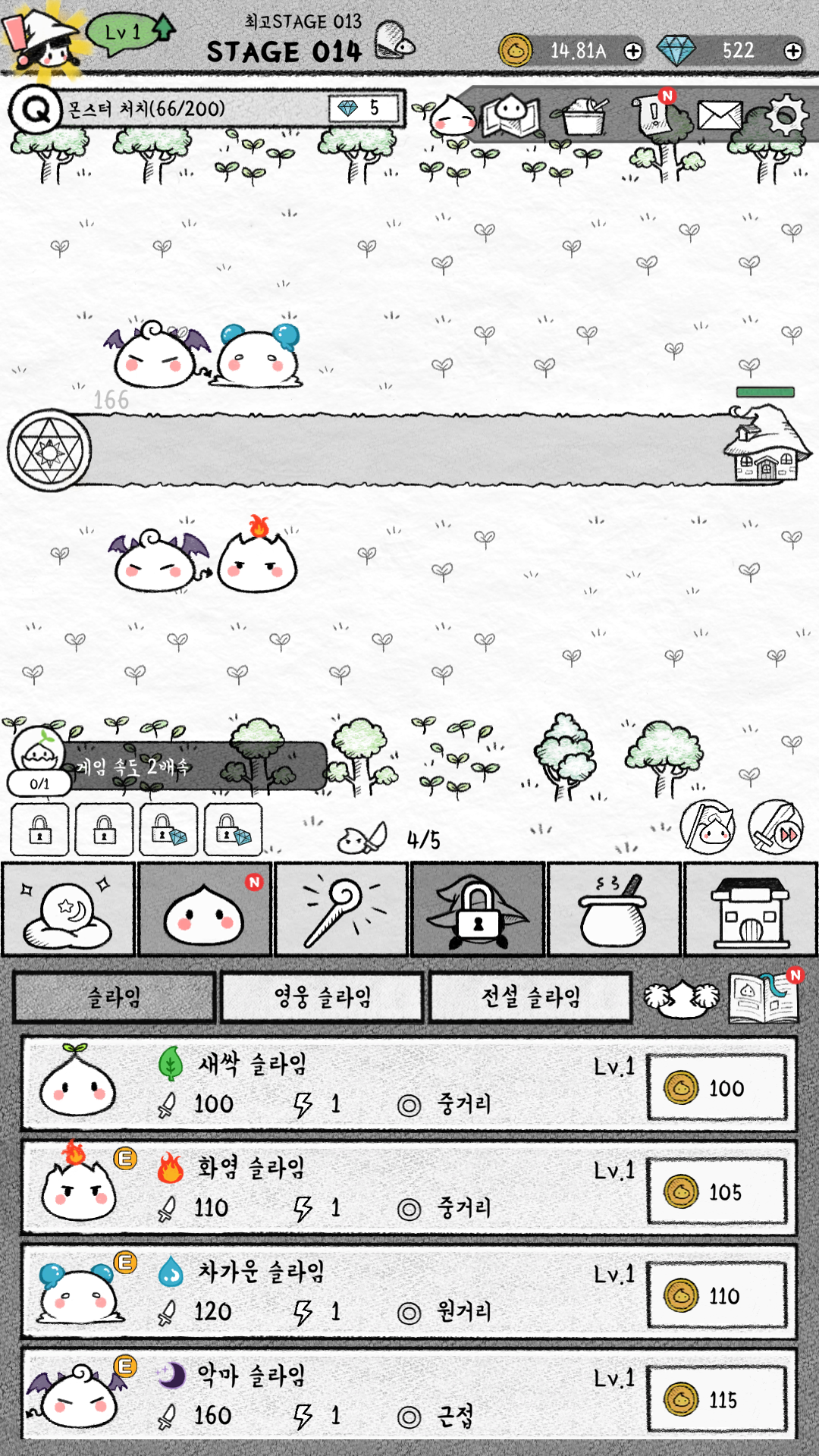 슬라임은 기본 슬라임, 영웅 슬라임, 전설 슬라임 이렇게 있는데, 이미 게임은 재미가 없다고 판단을 내렸지만 기본 슬라임의 가장 아래 슬라임이 궁금해서 거기까지만 진행해보기로 했습니다.