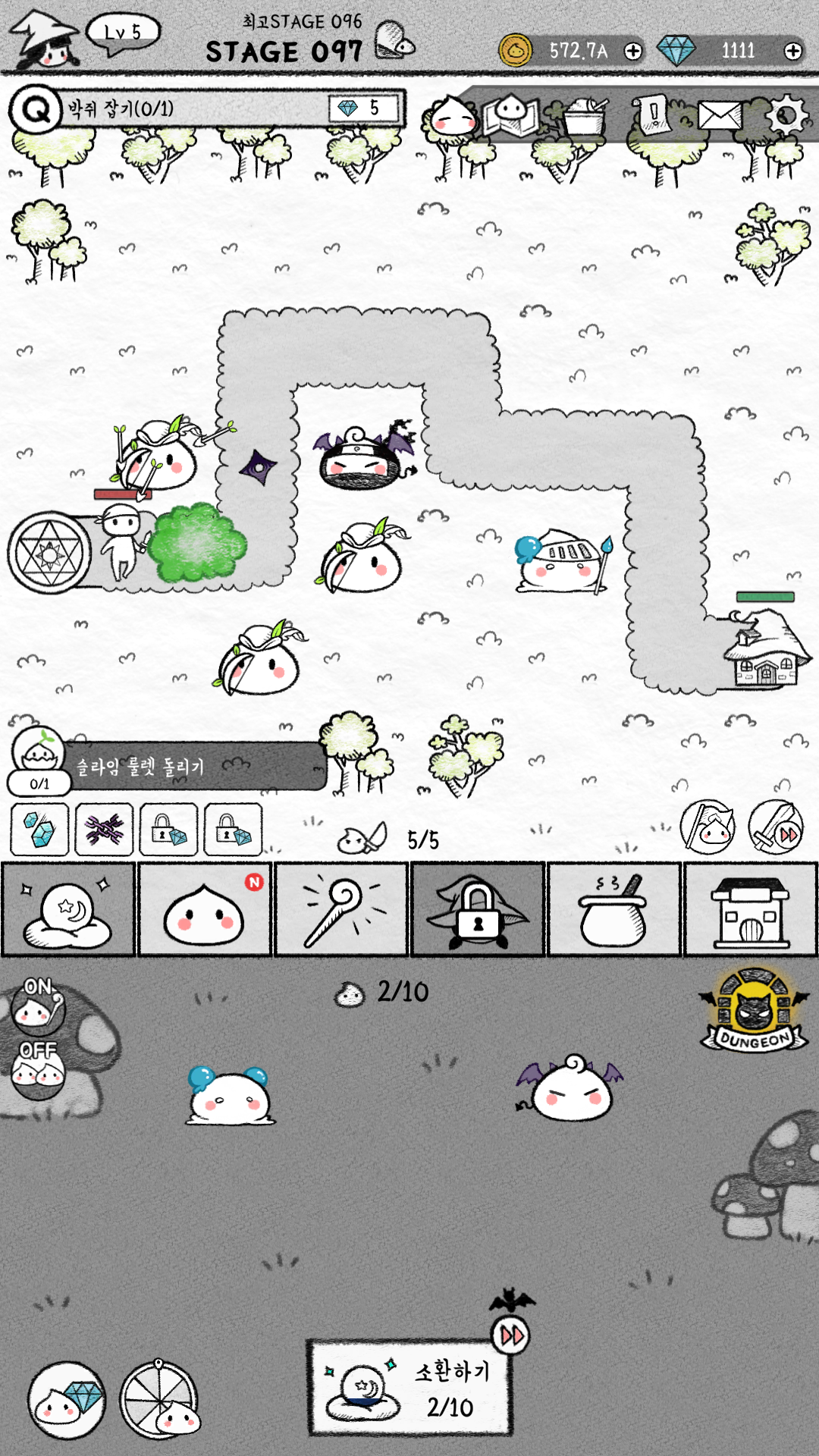 자동 소환과 자동 합성을 켜놓고 지켜봤는데 소환 가능한 슬라임이 가득 찼으나, 쿨이 되지 않아서 소환이 되지 않고 있습니다. 소환도 한 번에 다 해주는 게 아니라 딱 하나 해주고, 합성도 딱 하나 해줍니다. 결국 다이아로 업그레이드를 많이 해주거나 그게 아니라면 상당한 부분을 손으로 해야 돼요.