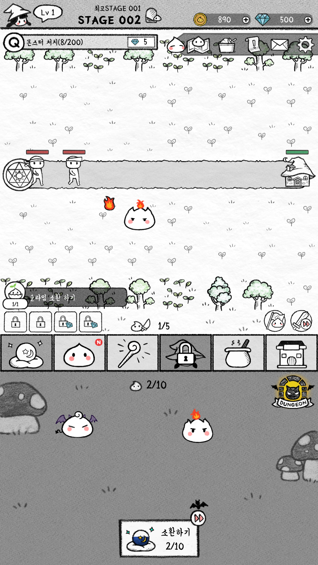 그런데 슬라임 소환이 직접 터치를 해서 소환을 해야 하고, 합성도 그래그&드랍으로 직접 합성을 해야 해요. 슬라임 소환은 하단에 보이는 구슬의 색이 가득 차면 하나씩 증가하는데, 그 간격도 짧아서 상당히 귀찮게 느껴집니다.