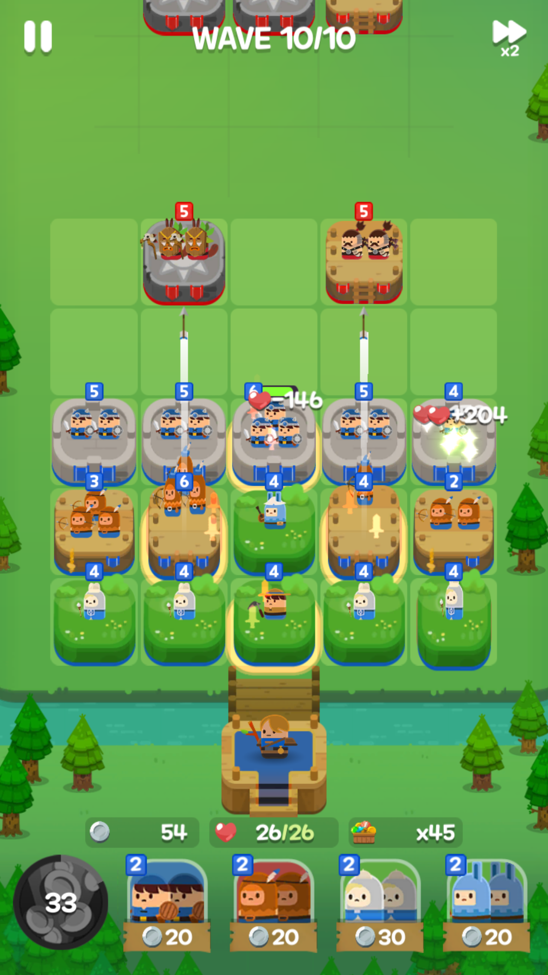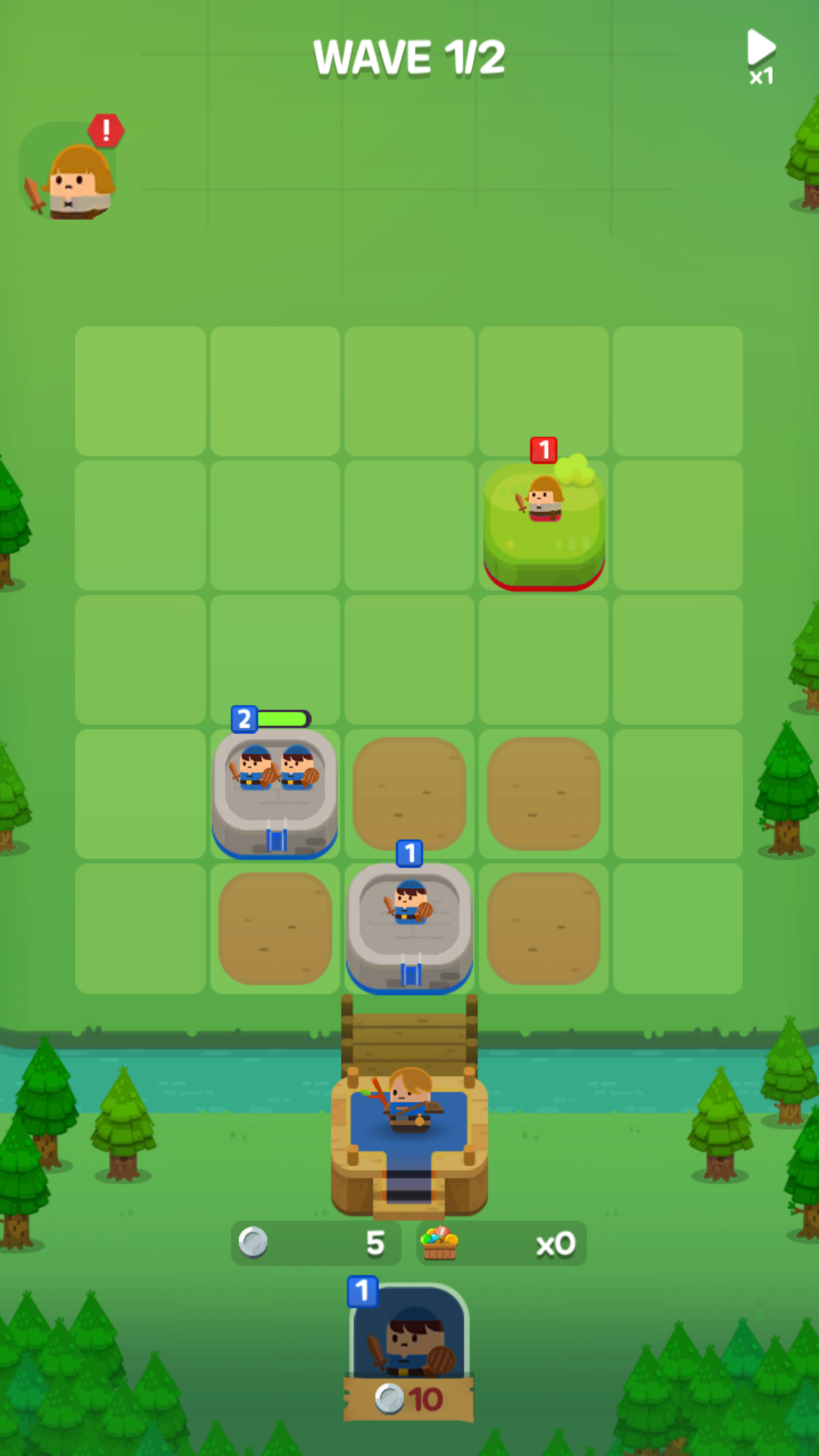 사령관을 향해 다가오는 적을 막는 게 목표이고, 적은 자동으로 한 칸씩 전진하며 사거리에 들어오면 전투가 진행됩니다. 주의할 점은 적과 가로 배치 상태에서도 싸우긴 하는데 앞으로 갈 수 있으면 계속 앞으로 가기 때문에 길목을 막는 게 중요합니다.