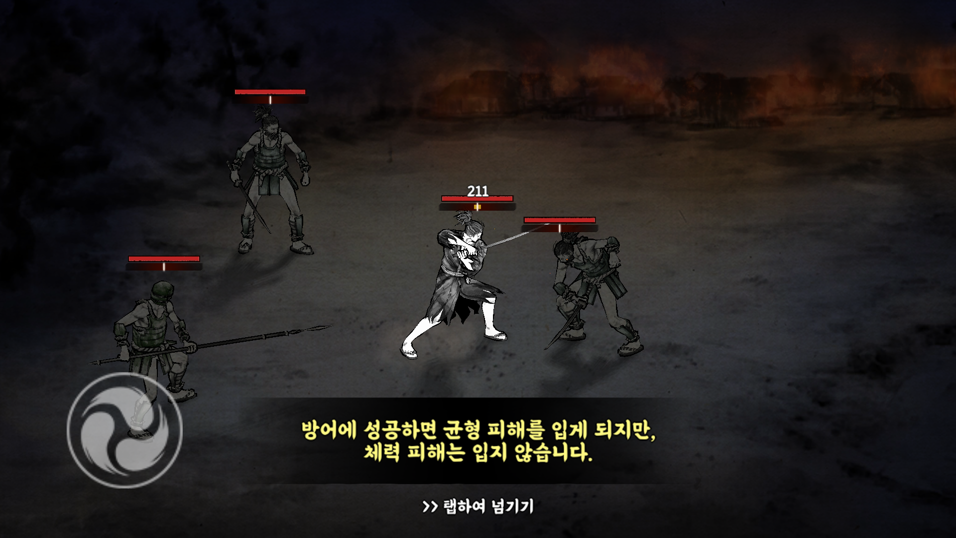 게임을 시작하게 되면 튜토리얼을 진행하는데, 우선 방어 버튼에 대한 설명을 합니다. 방어를 하게 되면 상대방의 공격을 막는 대신 균형 피해를 입게 되는데, 노란 게이지가 가득 차게 되면 그로기 상태에 빠지게 됩니다. 그리고 타이밍을 잘 맞춰 방어를 누르면 패링이 되는데 패링을 하면 상대에게 큰 균형 피해를 줄 수 있습니다.