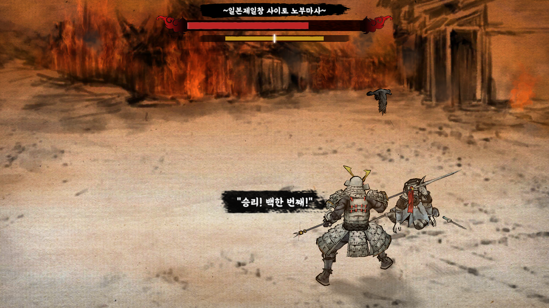 공격 버튼은 단순하게 공격 기능만 하는 게 아니라 일섬이라는 기술을 사용할 수 있는데요. 상대가 강한 공격을 하게 될 때는 방어를 해도 피해를 입게 되므로, 공격이라는 선택을 할 수 있습니다. 타이밍을 맞춰 공격에 성공하면 상대의 공격을 무시하고 일섬이라는 치명타 공격 기술이 나가게 됩니다.