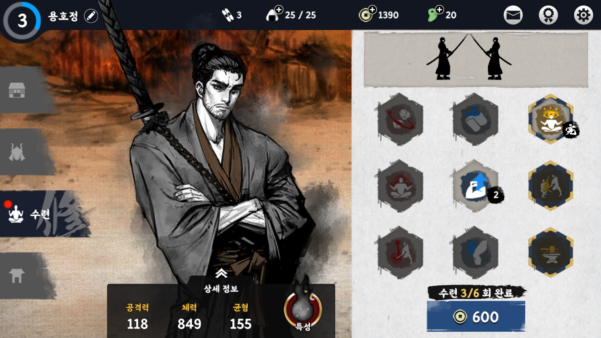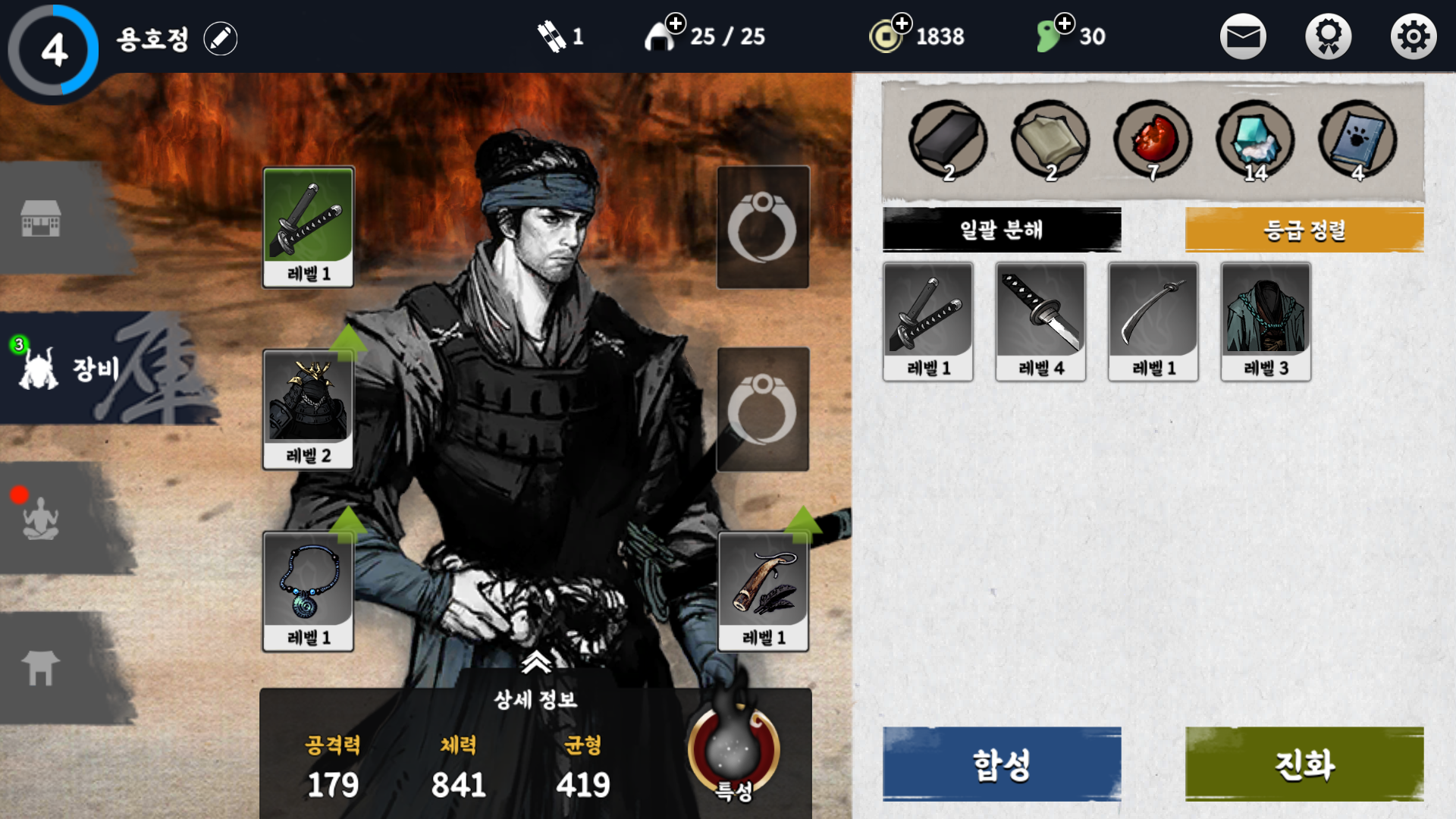 그리고 장비를 바꾸면 일러스트가 바뀌는 걸 확인하실 수 있는데요. 그 외에도 초반에 체력이 200이었는데 수련과 아이템을 통해 체력이 800까지 늘었습니다. 아이템은 구매와 광고를 통해서 얻을 수 있고, 같은 등급의 아이템 5개를 합성하여 더 높은 등급의 아이템을 얻을 수도 있습니다.