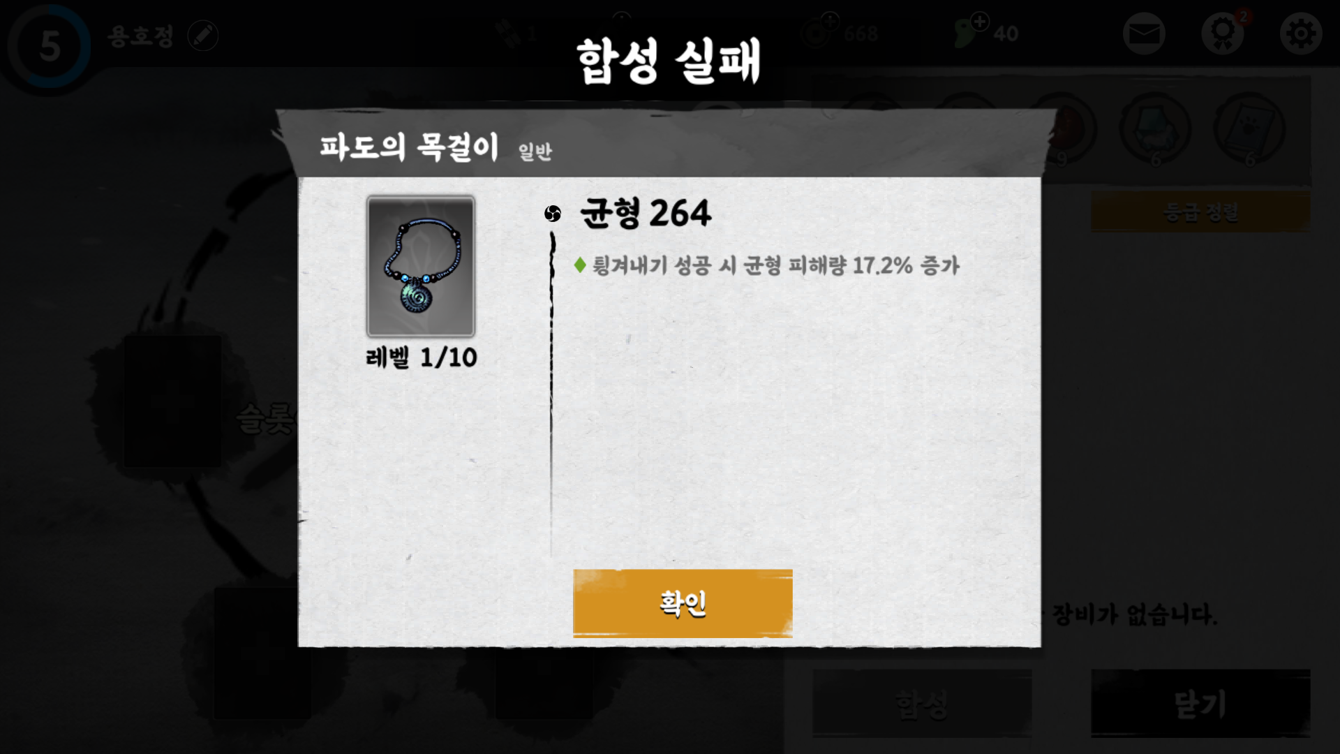 결과는 합성 실패. 합성을 성공하면 다음 등급의 장비가, 합성을 실패하면 같은 등급의 장비가 나오나 봐요.