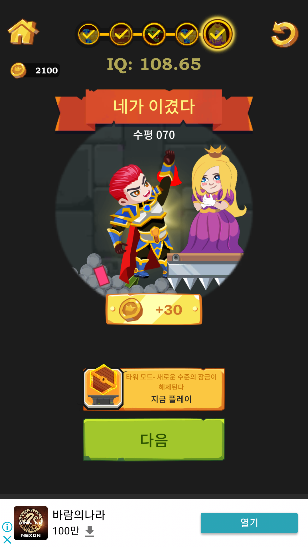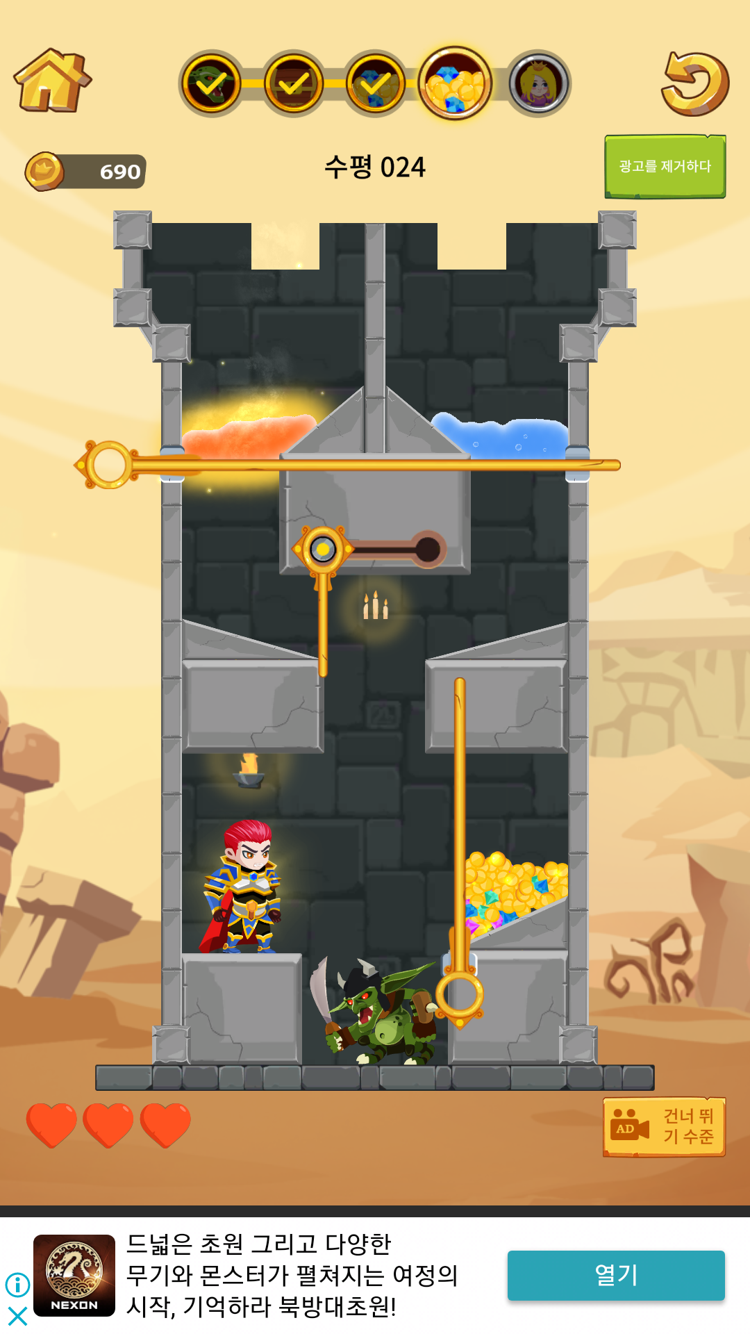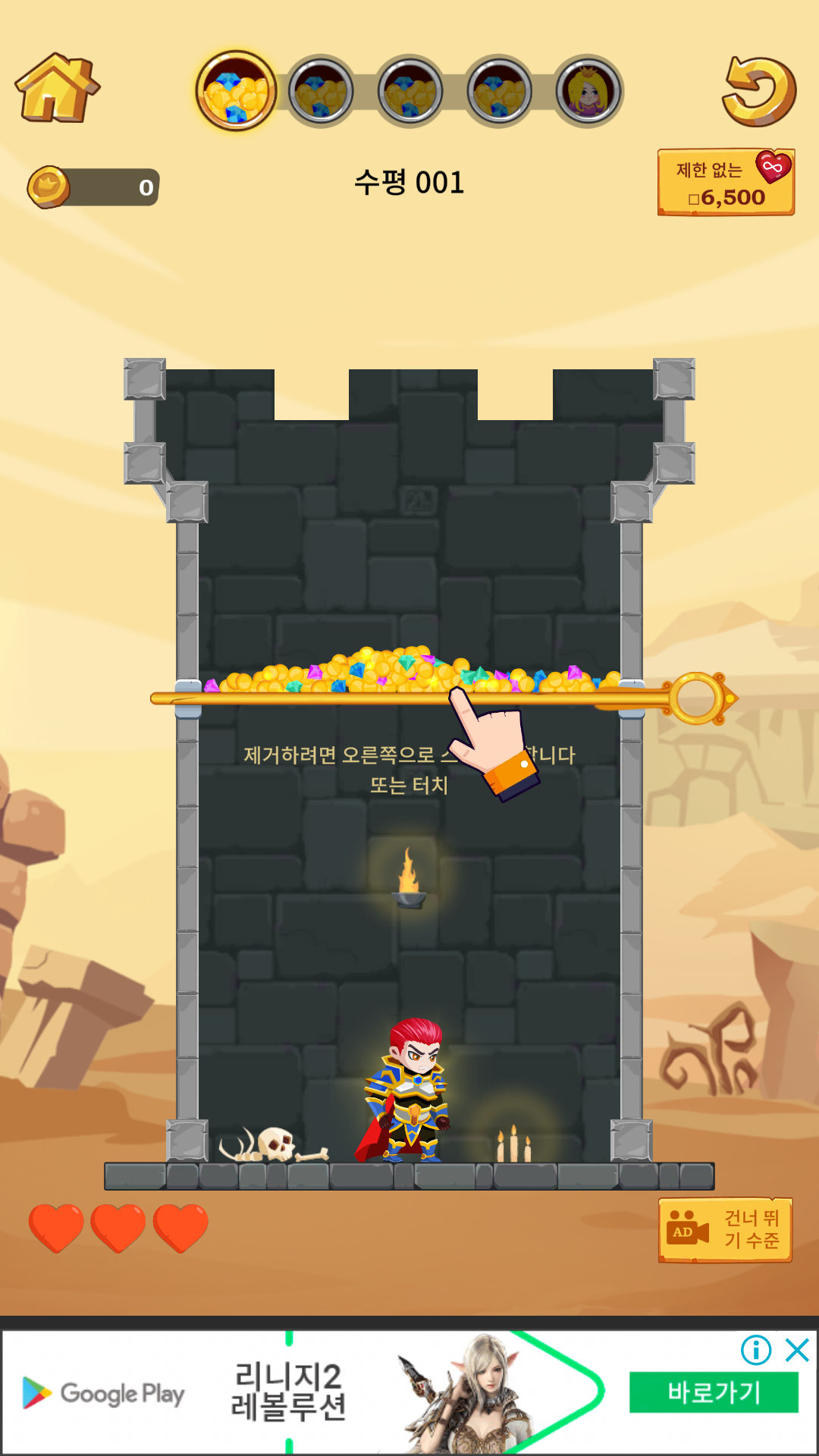바로 이런 게임인데, 화면의 막대를 스와이프 하여 보물이나 공주를 구하는 퍼즐 게임입니다. 막대의 순서에 따라 결과가 바뀌므로, 나중에는 순서를 잘 생각해서 진행해야 해요.