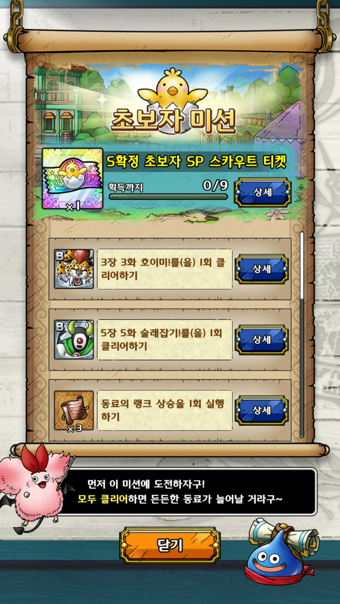 오늘 플레이 후기를 작성할 게임은 '드래곤 퀘스트 택트'입니다. 저는 드래곤 퀘스트 게임 시리즈를 해본 적이 없어서 특별히 더 재밌다는 느낌은 받기 어려웠고, 게임 스타일과 효과음은 예전에 cd로 플레이하던 RPG 게임을 생각나게 하네요. 또, 지금 시작하면 보석 3천 개를 주고 2-1을 클리어하면 동료를 뽑는 스카우트를 할 수 있는데 반복이 쉬워서 본격적으로 하실 분들은 리세마라를 하기 편하다는 장점이 있습니다.