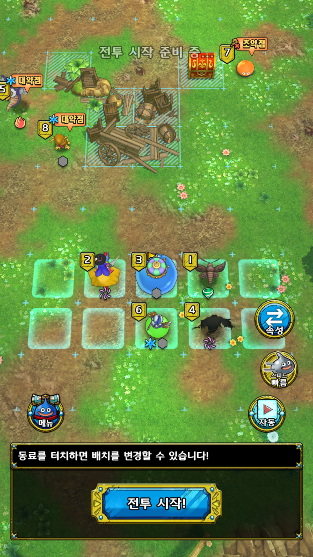전투는 시작하기 전에 배치를 변경할 수도 있습니다. 어차피 초반에는 난이도도 쉽고 오토로 진행해서 크게 상관없을 거예요. 그리고 몬스터마다 속성이 있고