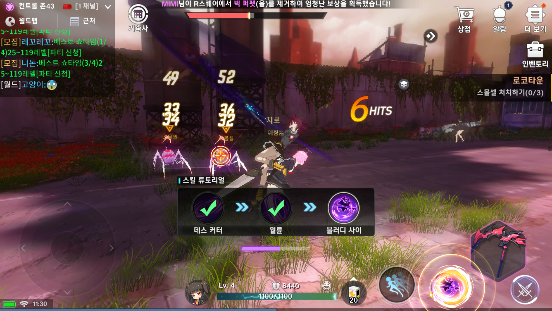 첫 보스를 만났는데 보스를 보니 예전에 봤던 기억이 납니다. 회피를 타이밍에 맞춰 사용하면 '소울 타임'이 발동하여 몬스터가 느려지는데 보스전이 초반이라 지금은 오토로 플레이가 가능하지만, 나중에는 회피 조작만큼은 수동으로 해야 할 수도 있겠어요.