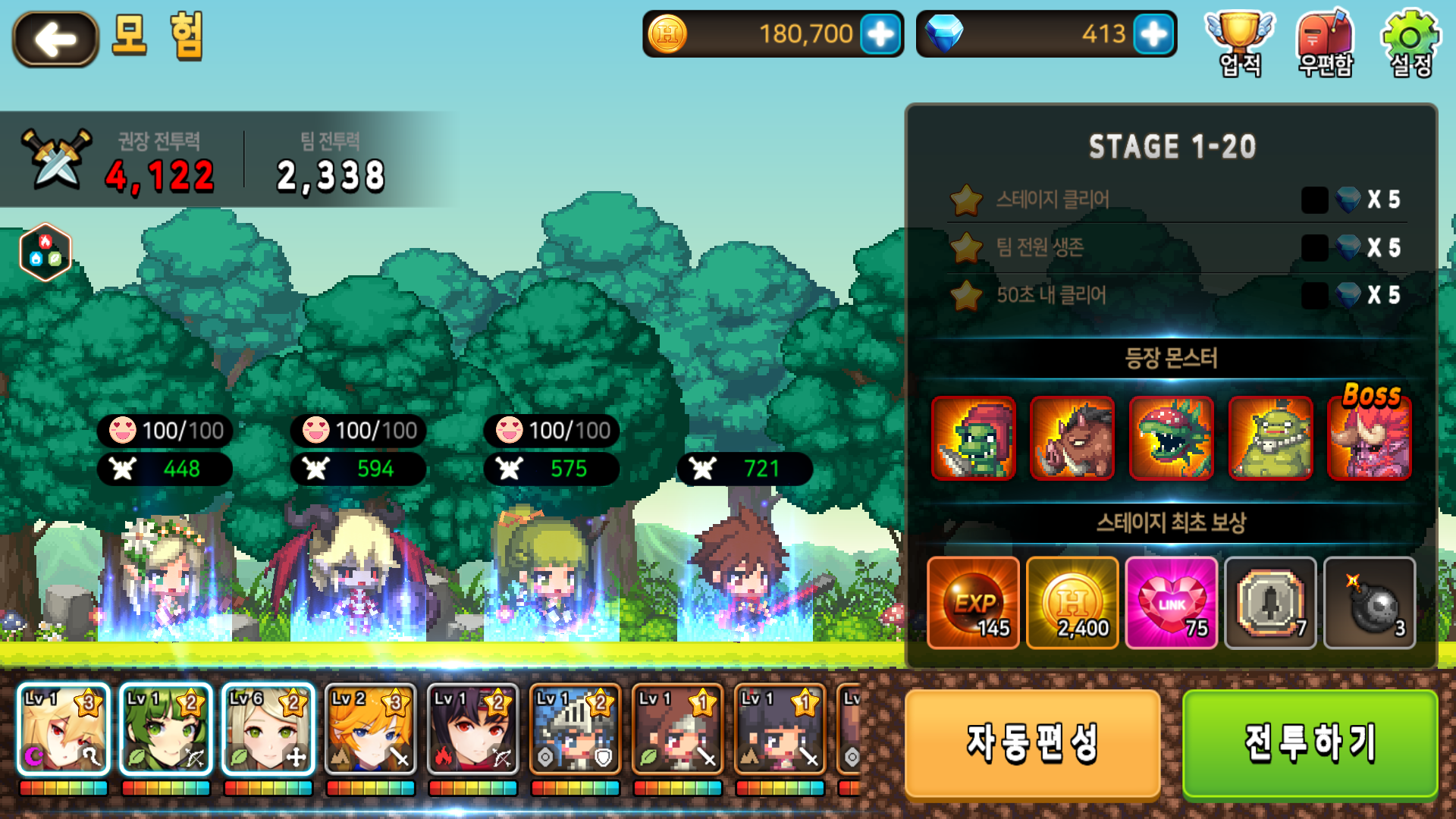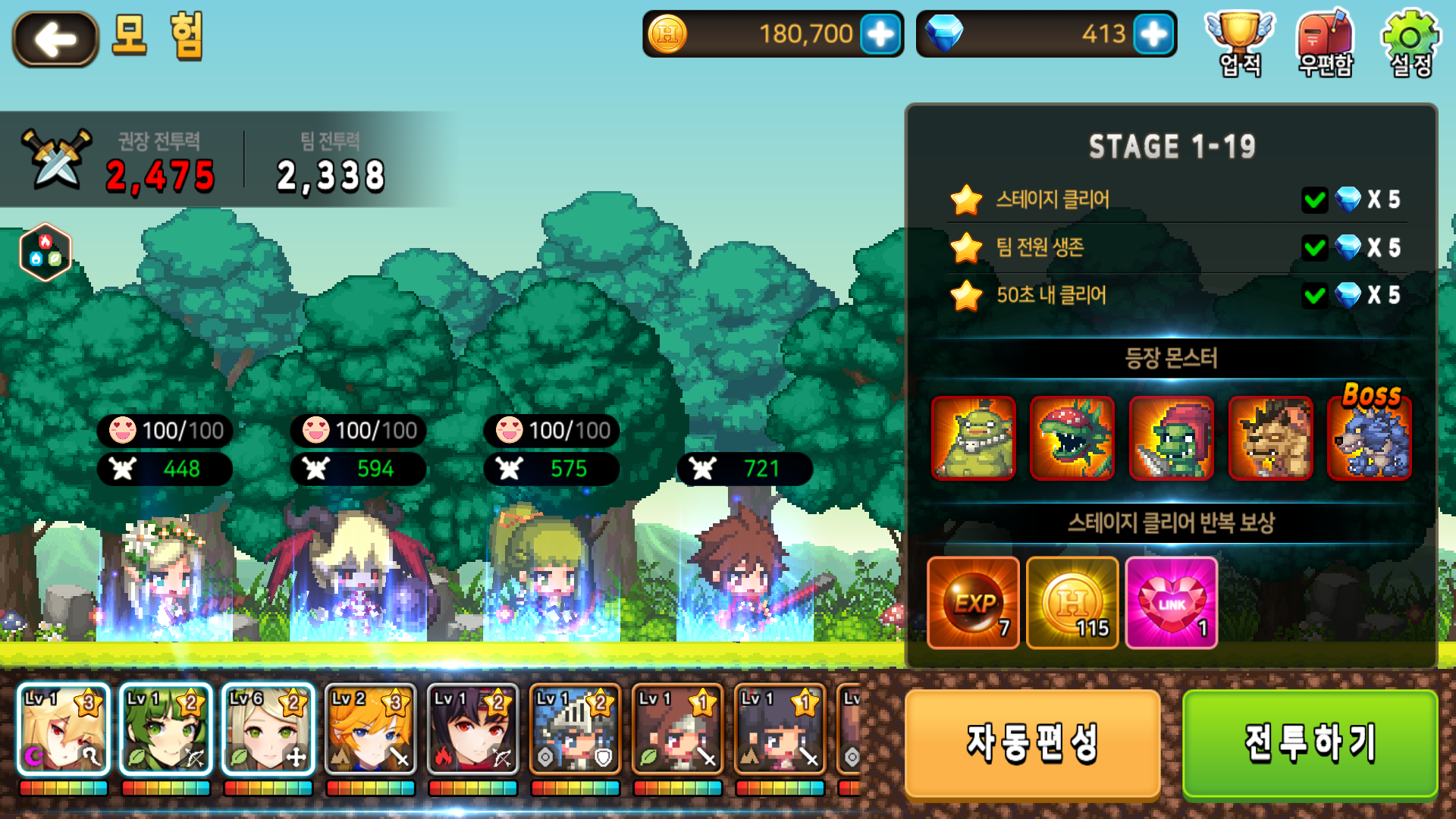 모험을 진행하다 보니 힐러가 필수입니다. 조금 낮은 전투력으로도 3성 클리어를 가능하게 해 줘요. 그런데 등장 몬스터에 보이는 고블린과 늑대, 오우거까지 크루세이더 퀘스트와 되게 비슷합니다. 왜 같은 도트 컨셉의 게임에서 둘 다 해본 유저라면 느낄 수 있을 만큼 똑같이 만들었는지 궁금하네요.
