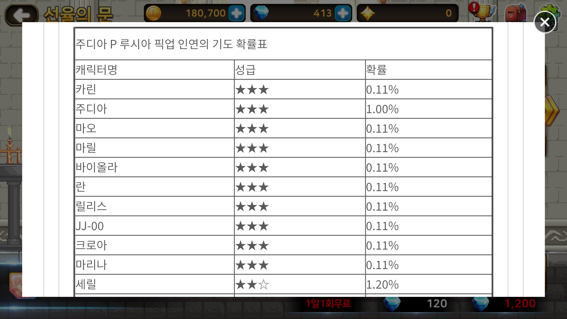 사전예약 보상으로 주는 3성 캐릭터 릴리스입니다. 뽑기 확률을 보니 3성 캐릭터 하나당 0.11%로 꽤 낮네요.
