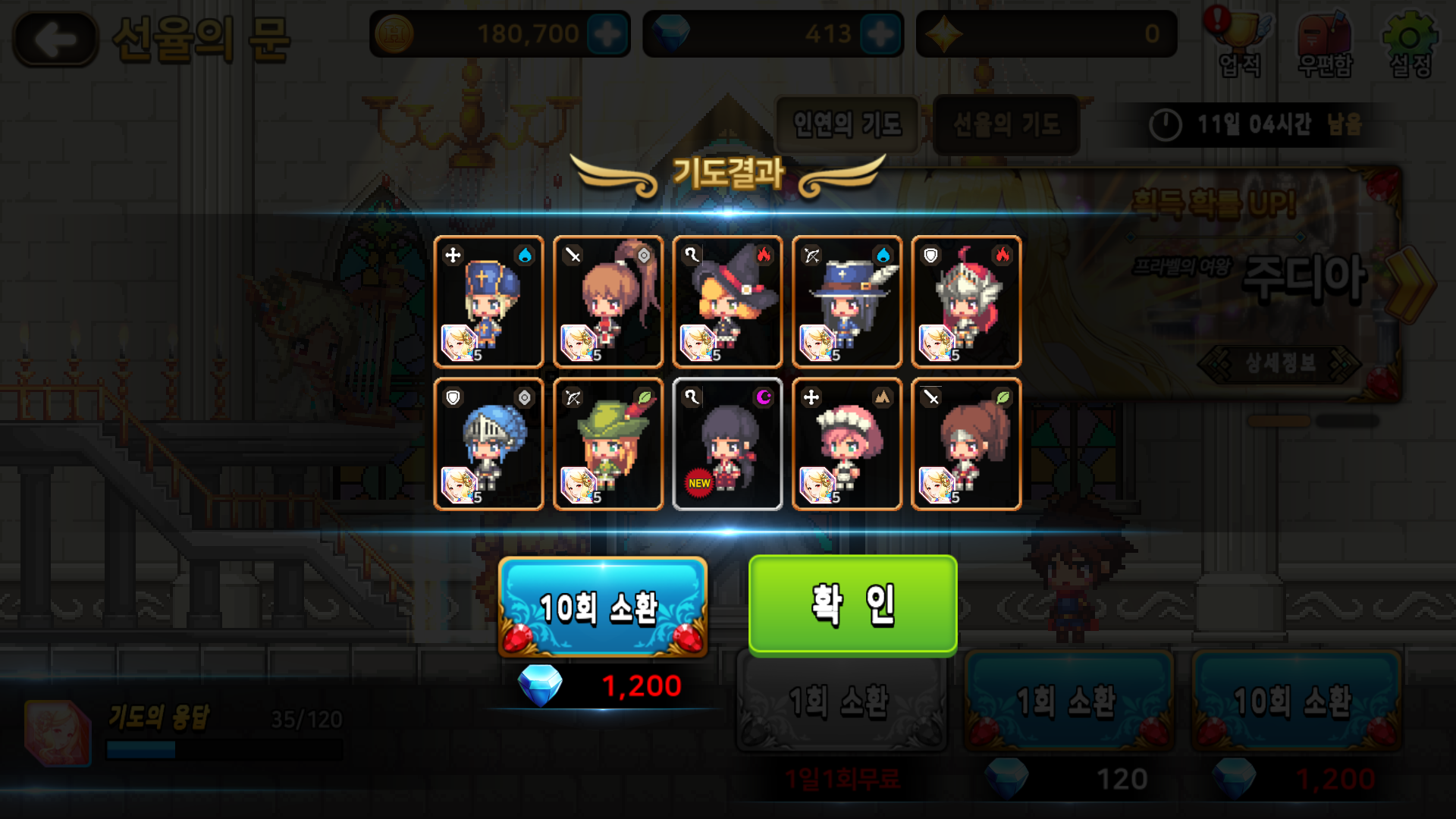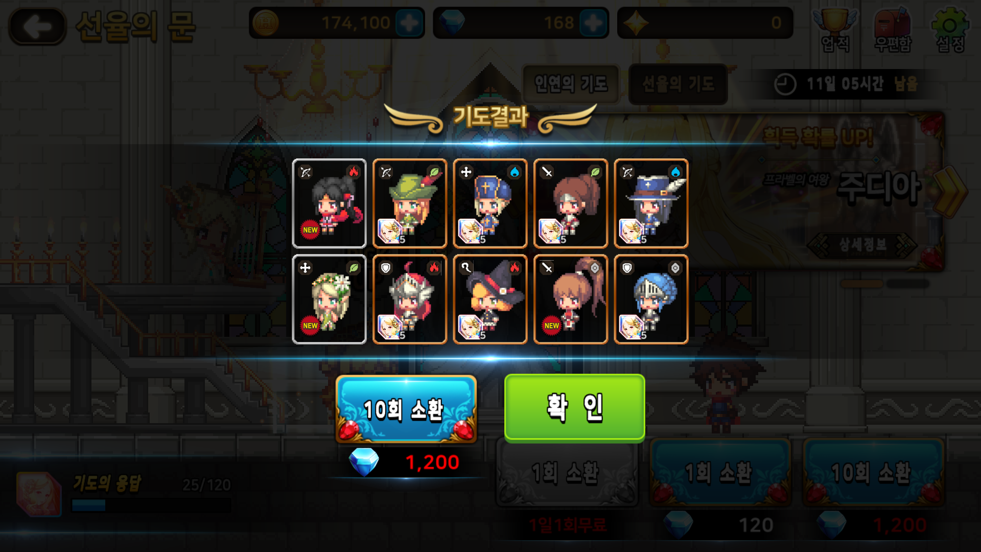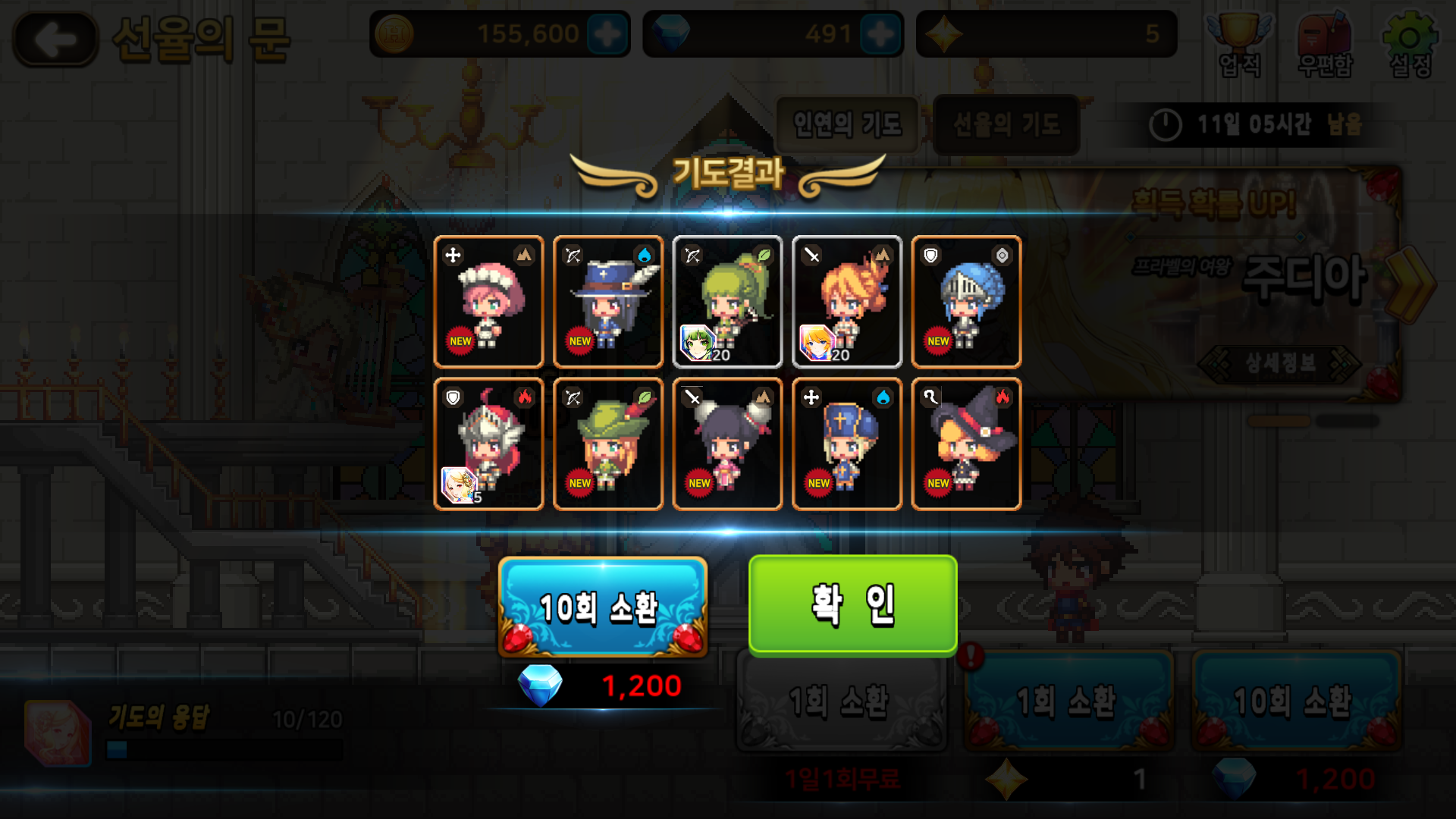 첫 번째 뽑기 결과. 2성 캐릭터가 2개, 나머지는 1성입니다.