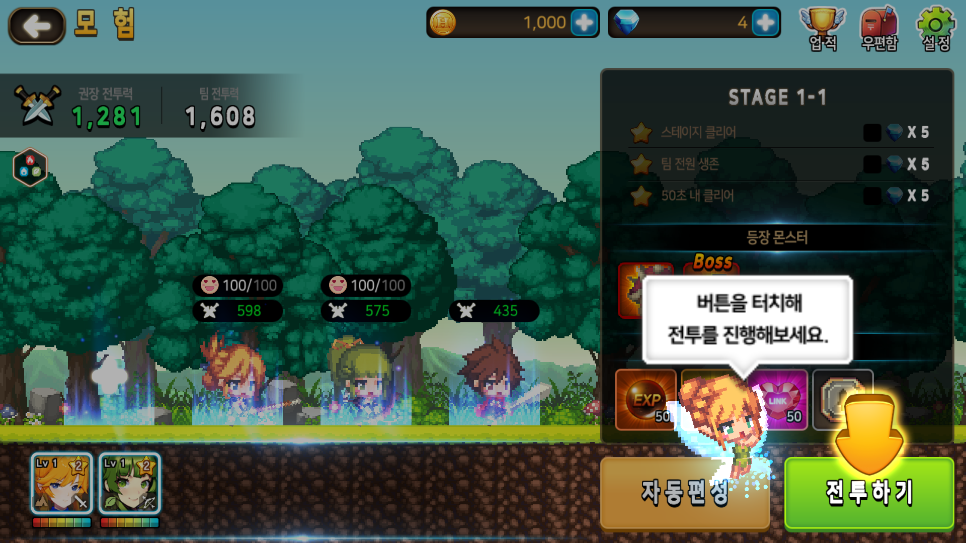 특이한 점이 스테이지가 맵 형식으로 되어있고, 직접 움직여서 스테이지에 입장합니다. 그리고 주변에서 몬스터를 잡아서 골드를 얻거나, 상자를 열어서 보석을 얻고, 광석을 캐서 광물을 얻을 수 있었는데 이런 부분은 나중 가면 귀찮아질 수 있겠지만 첫 느낌은 되게 괜찮네요.