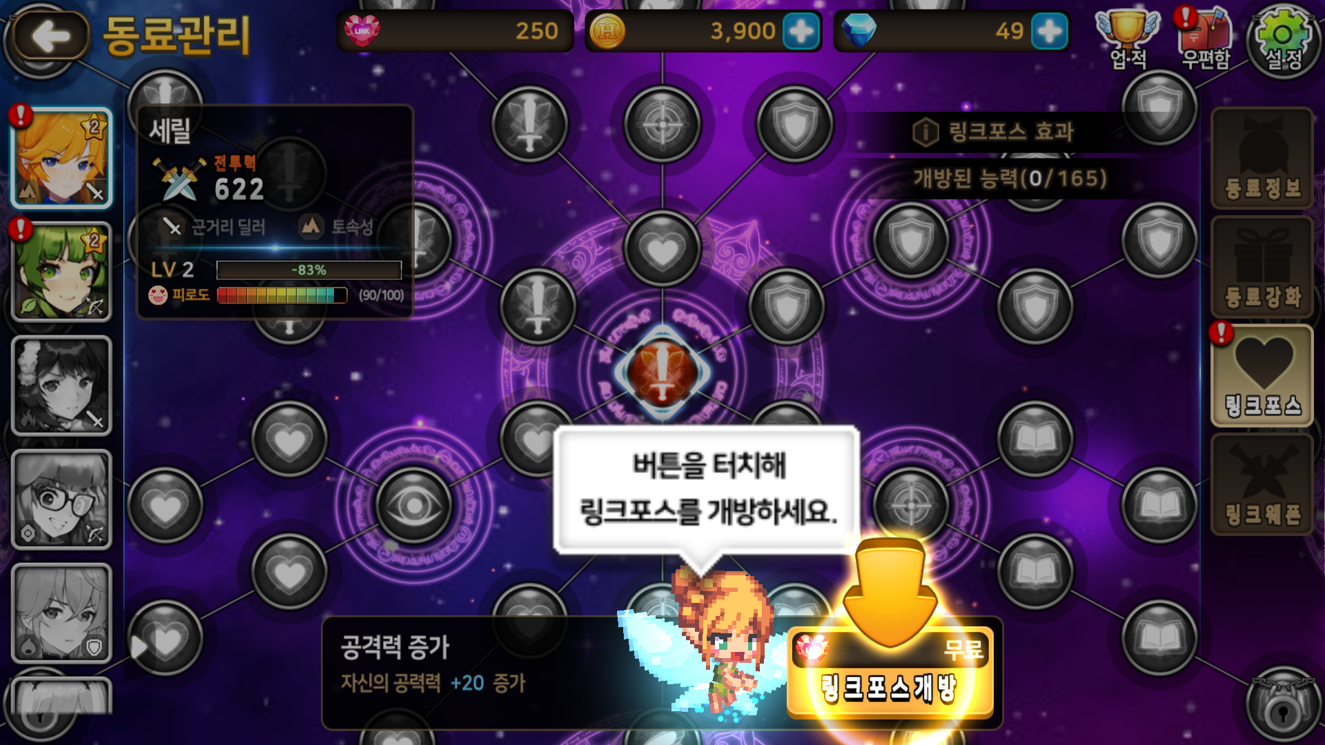 동료 강화 시스템으로는 링크 포스라는 것도 있는데 이건 가디언 테일즈의 각성 시스템이 떠오르네요. 노드 시스템은 흔한 시스템이기 때문에 딱히 그걸 따라 했다기보다는 같은 도트 게임이다 보니 생각이 났습니다. 근데 뭔가 UI가 되게 옛날 느낌이 나요.