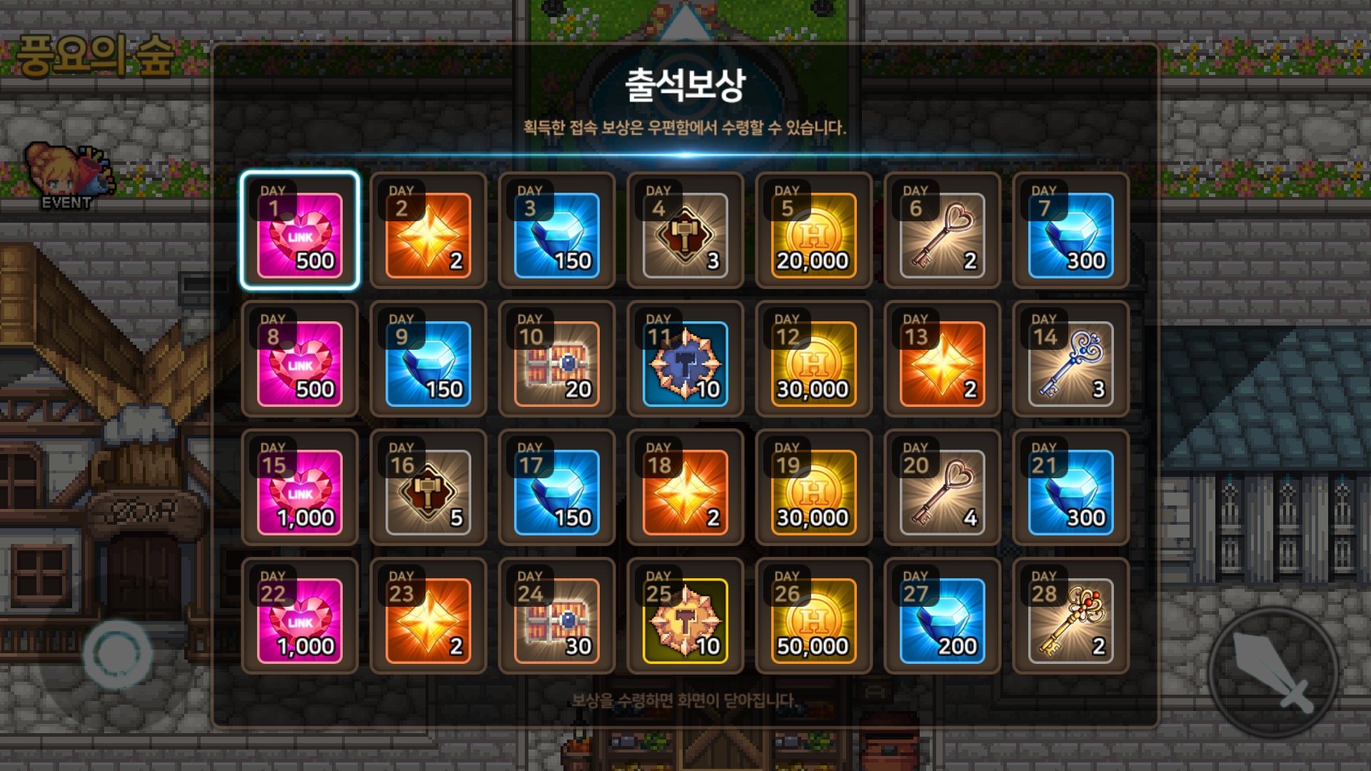우선 스토리를 보고 나면 출석 보상이 나오는데 보상 중에서 특별한 품목은 안 보이네요.