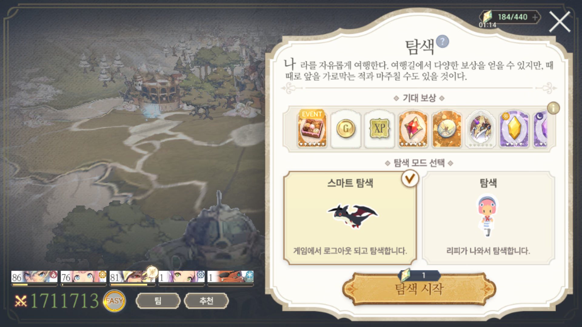 게임이 스토리가 막히면 하루에 할 수 있는 게 한정적인데, 탐색을 통해서 각종 아이템과 재화를 수급할 수 있습니다. 스마트 탐색은 게임이 종료된 상태에서도 탐색을 진행하는데, 스마트 탐색에서는 '게일'이라는 NPC가 등장하지 않으니 탐색으로 하루에 한 번 등장하는 '게일'을 잡고 스마트 탐색을 돌리셔야 합니다.