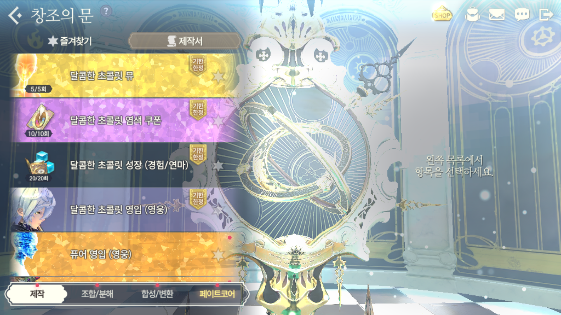 창조의 문에서는 아이템을 제작할 수 있는데, 기존 유저 조차 말리는 몇 가지가 있습니다. 엑소스 히어로즈 공식 카페에 공략 게시판에서 재화 사용을 검색하시면 정리가 된 글도 있으니 하기로 마음먹으셨으면 카페를 자주 이용하시는 게 좋아요. 다시 말씀드리지만, 게임이 어려워서 기존 유저분들이 정리한 글을 읽어보시고 방향을 알아야 게임이 할만합니다. 몰라도 해보면서 효율 따지면 되긴 하는데, 아마 나중에 손해 봤다고 생각하는 부분이 생길 거예요.