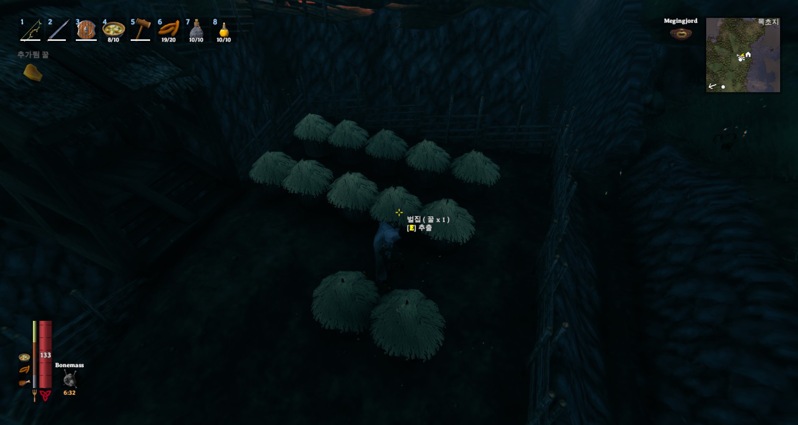 꿀을 얻기 위해서는 여왕벌을 얻어서 벌통을 지어야 하는데, 맵을 돌다 보면 버려진 건물들이 있습니다. 그 건물에서 벌 소리가 들리면 이렇게 벌집이 있는 걸 발견하실 수 있습니다.