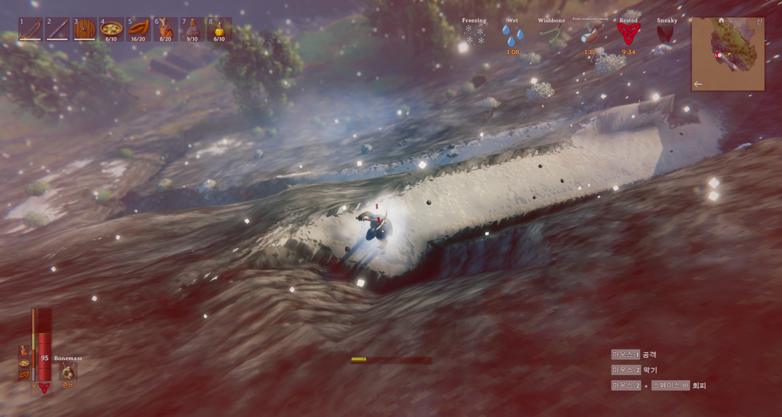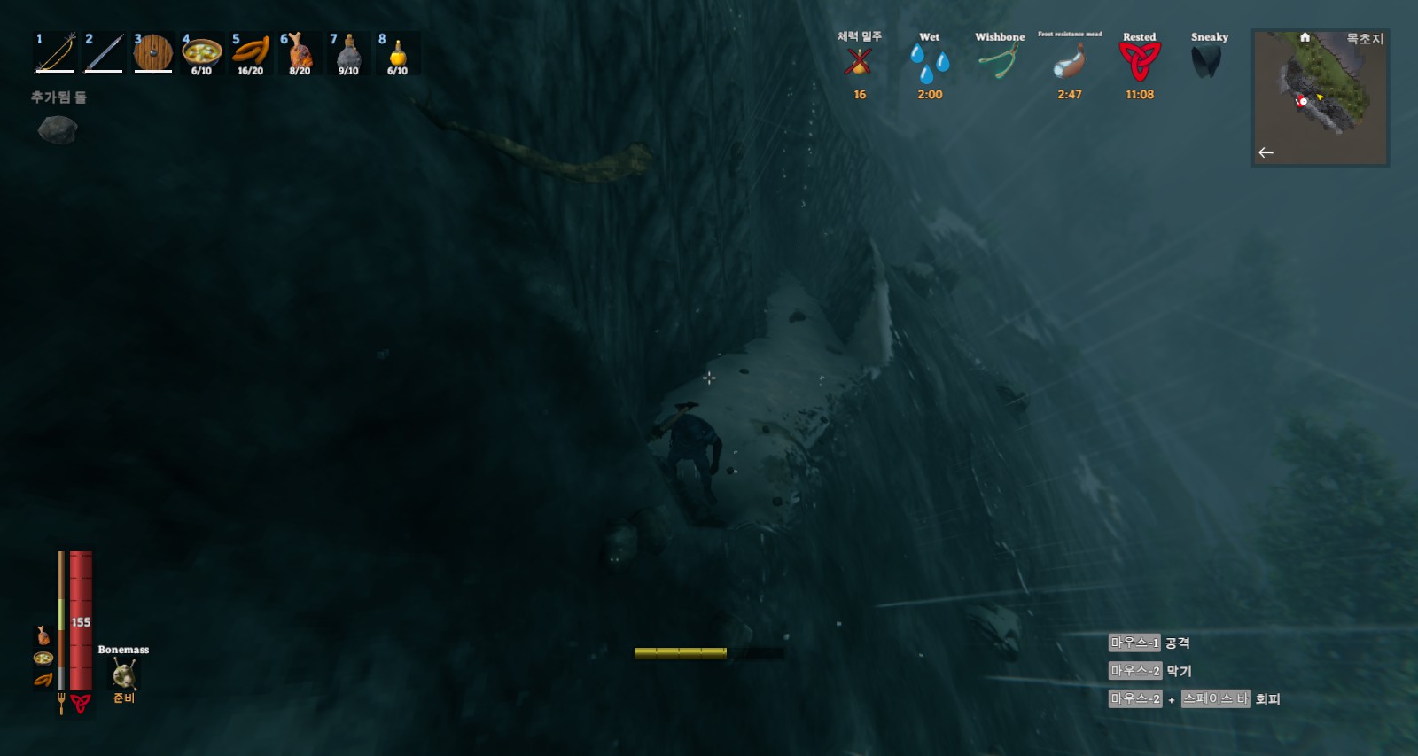 그런데 비를 맞고 와서 젖은 상태가 되니 냉기 저항 포션을 마셔도 틱 대미지가 들어오네요.