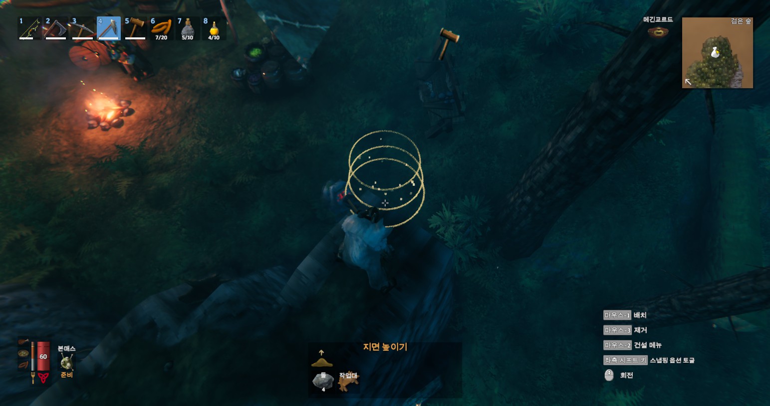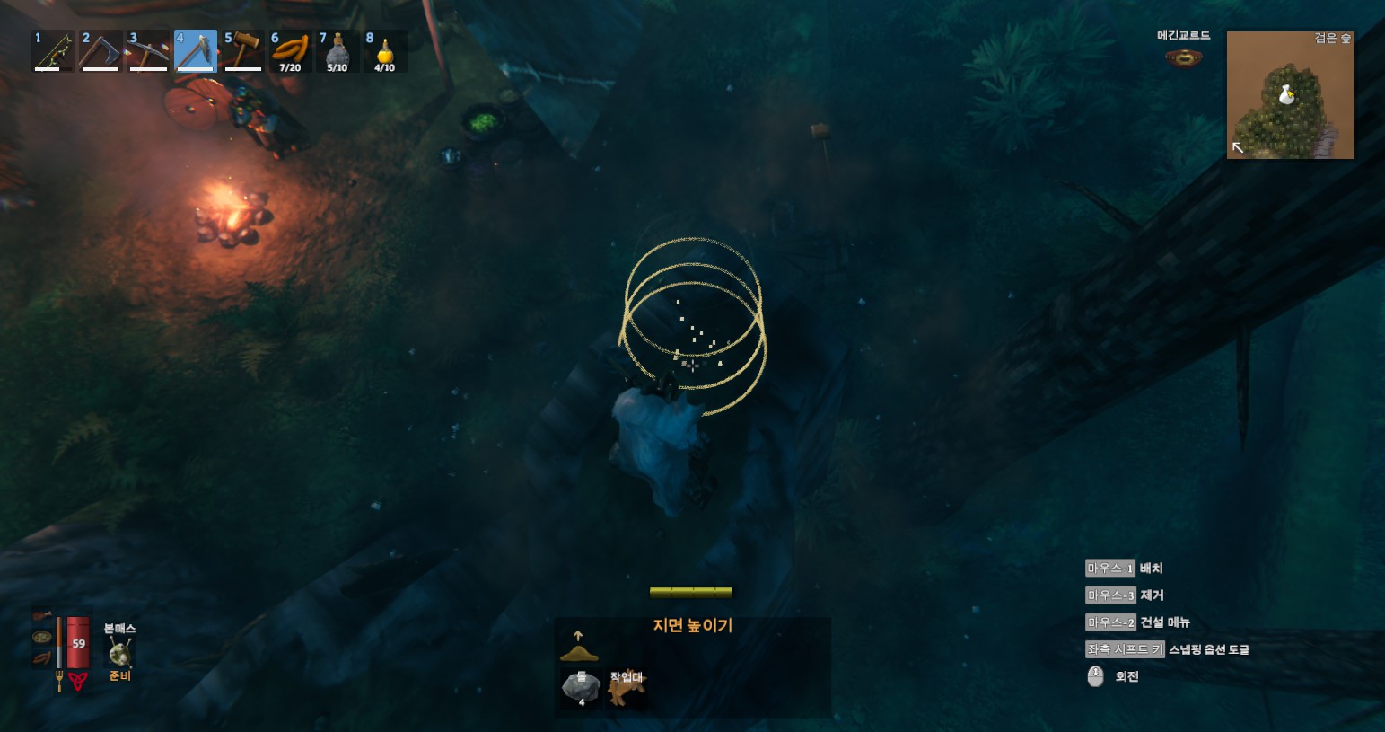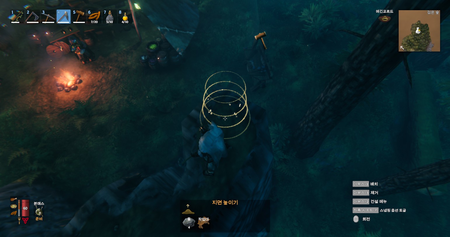 방법은 간단합니다. 발하임은 시스템상 땅굴을 팔 수 없다는 부분과 돌을 깎으면 아래를 쳐도 윗부분부터 깎이고, 돌을 쌓으면 윗부분을 쌓을 때 아랫부분이 채워지는 원리를 이용하면 됩니다. 마우스 포인트를 화면처럼 아래에 두지 마세요.