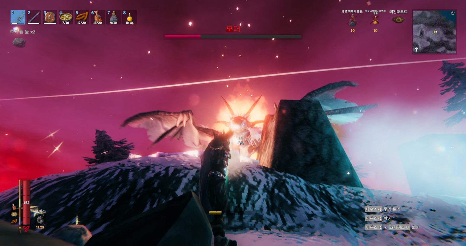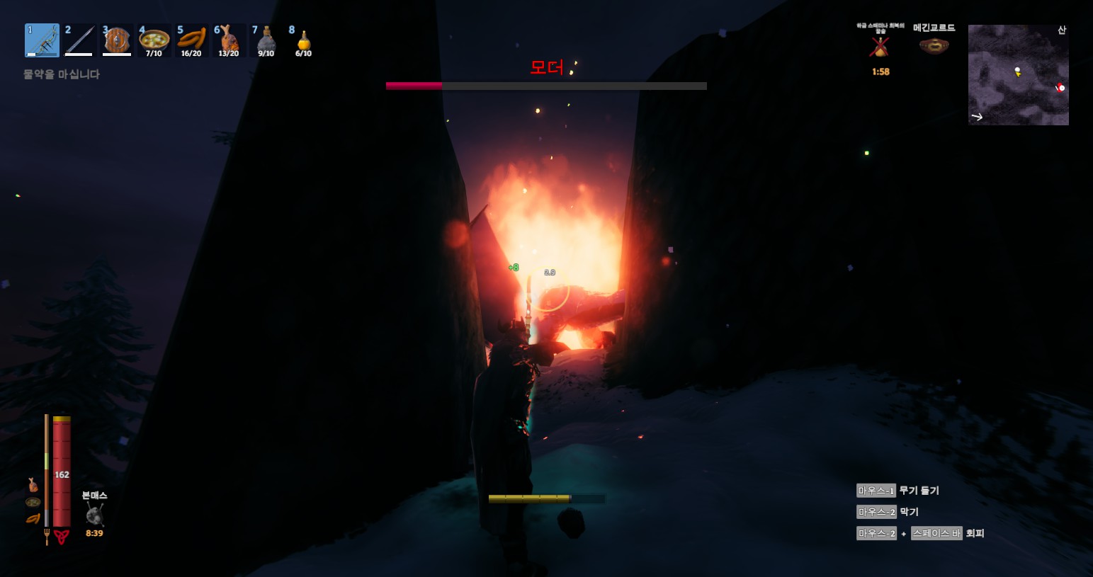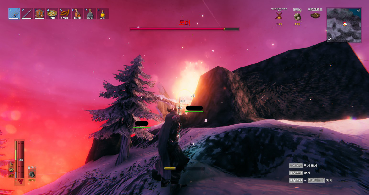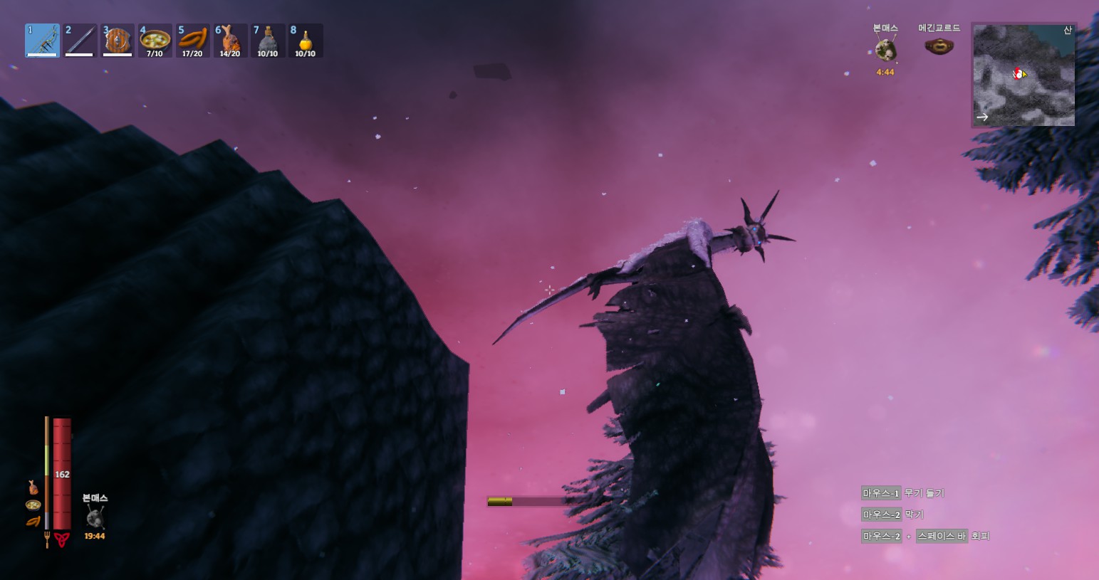 보스 자체 난이도는 혼자서도 잡을만한데, 활 내구도가 버티지를 못 하네요. 사실 벽을 안 만들어도 바닥 평탄화 작업만 좀 해두면 충분히 잡을만합니다.