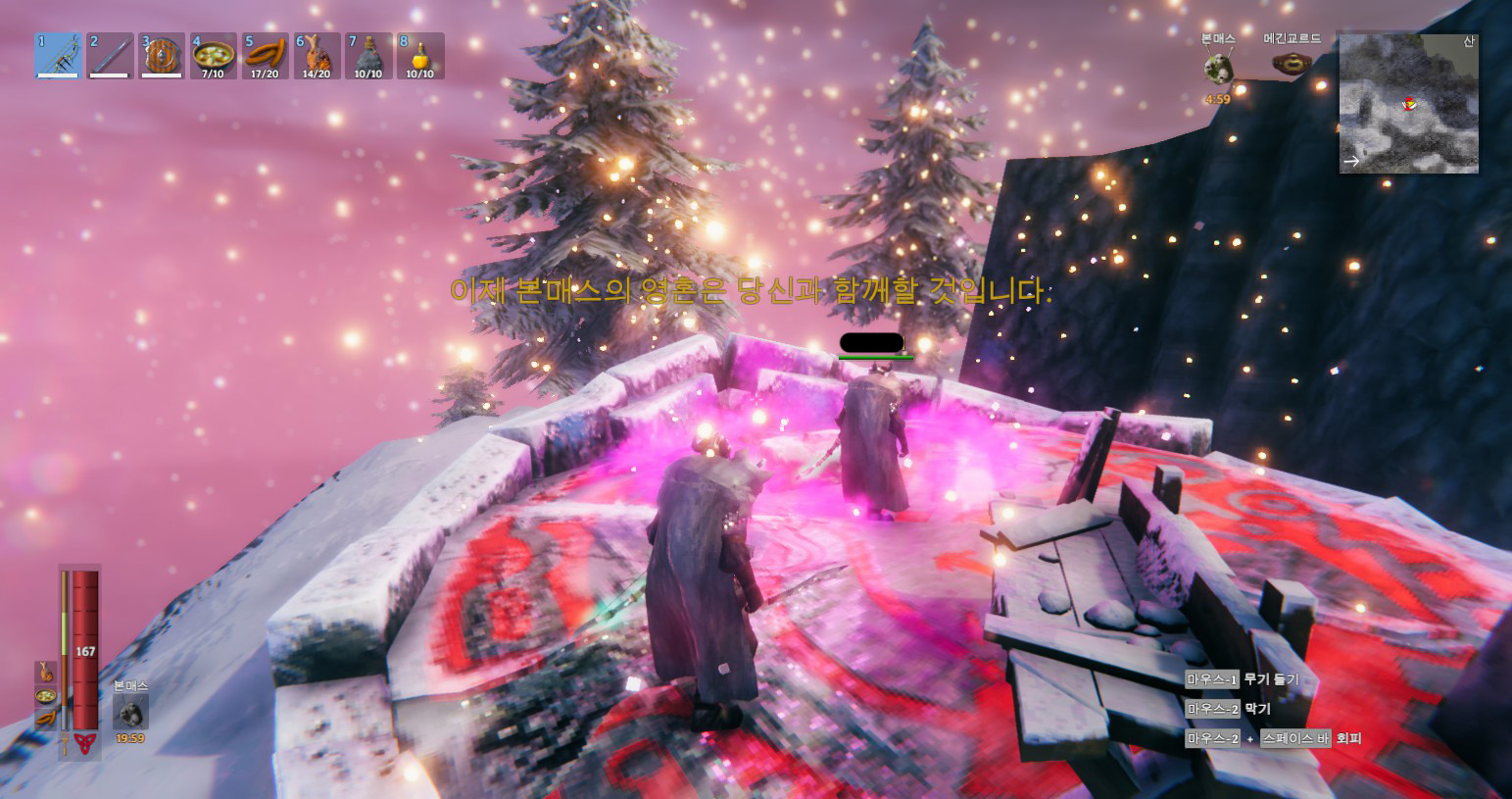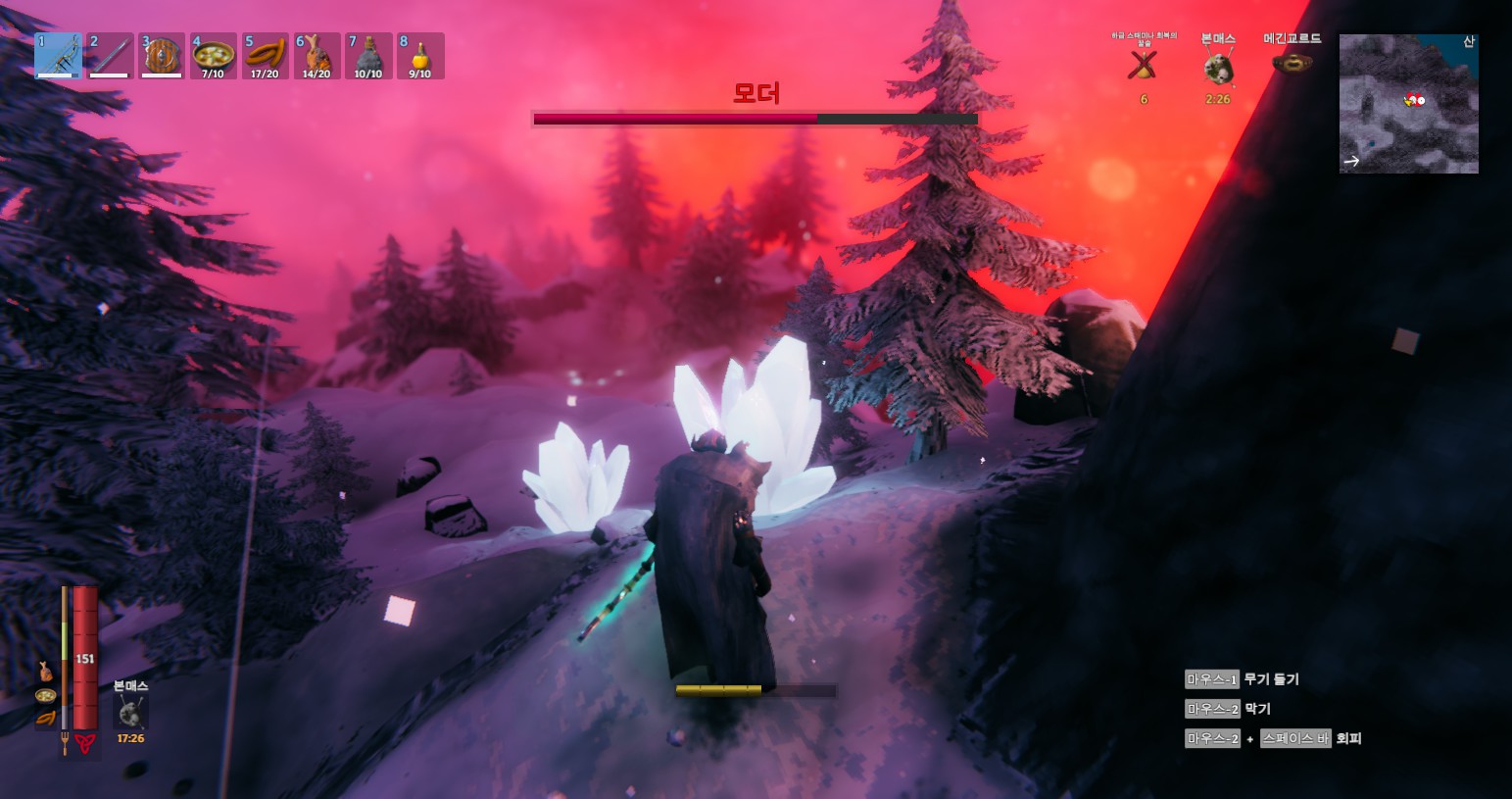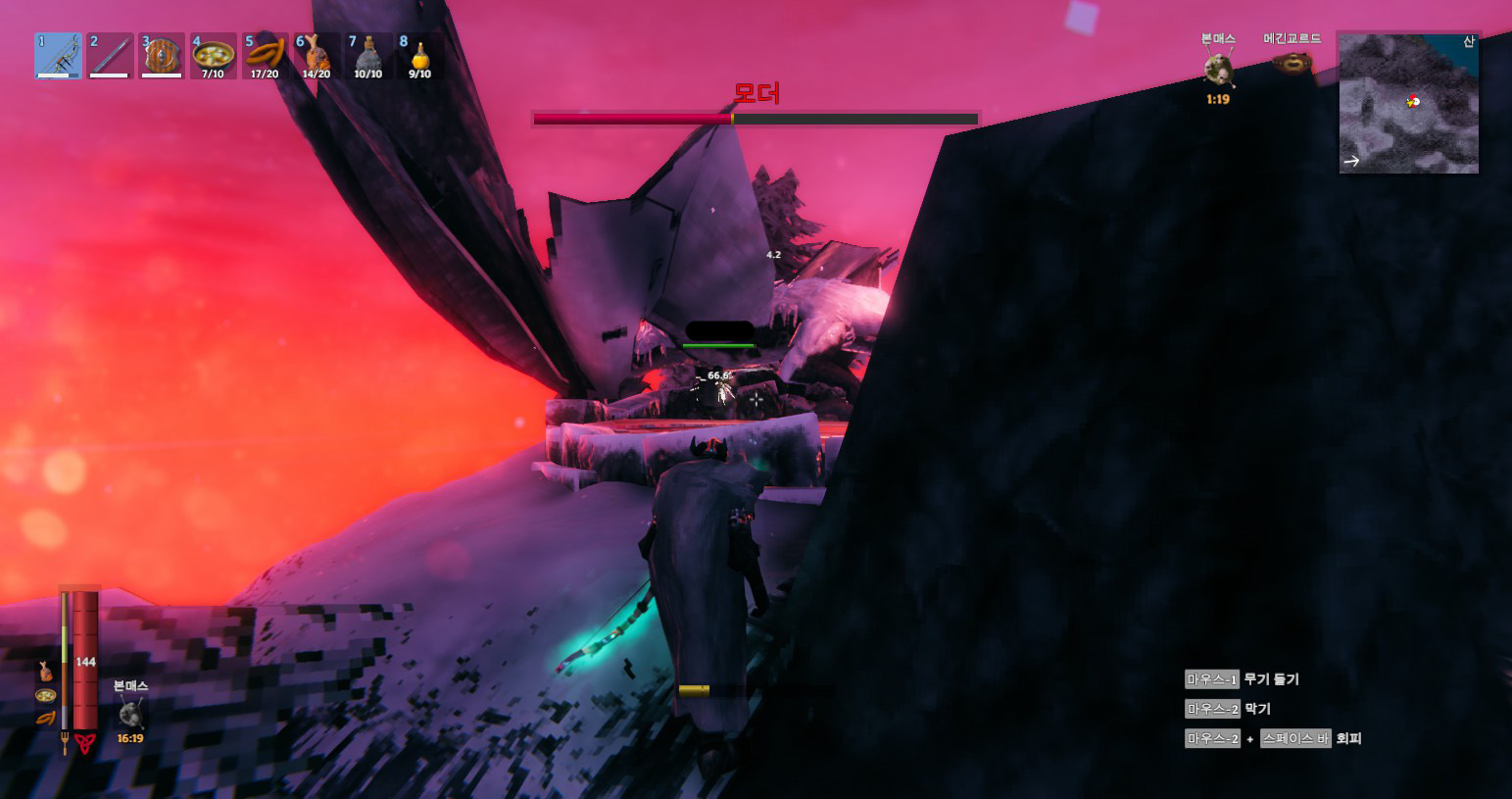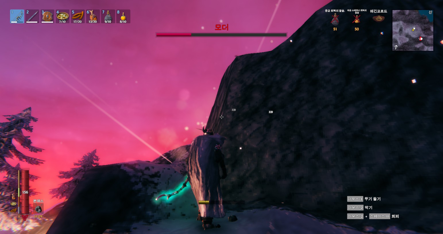 보스 자체 난이도는 혼자서도 잡을만한데, 활 내구도가 버티지를 못 하네요. 사실 벽을 안 만들어도 바닥 평탄화 작업만 좀 해두면 충분히 잡을만합니다.
