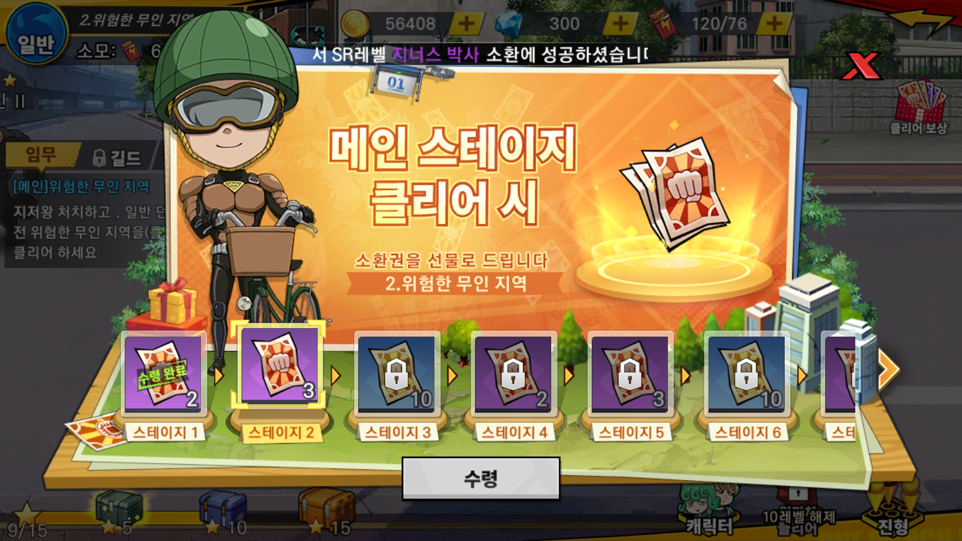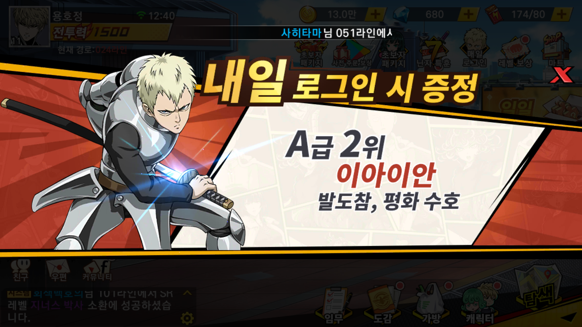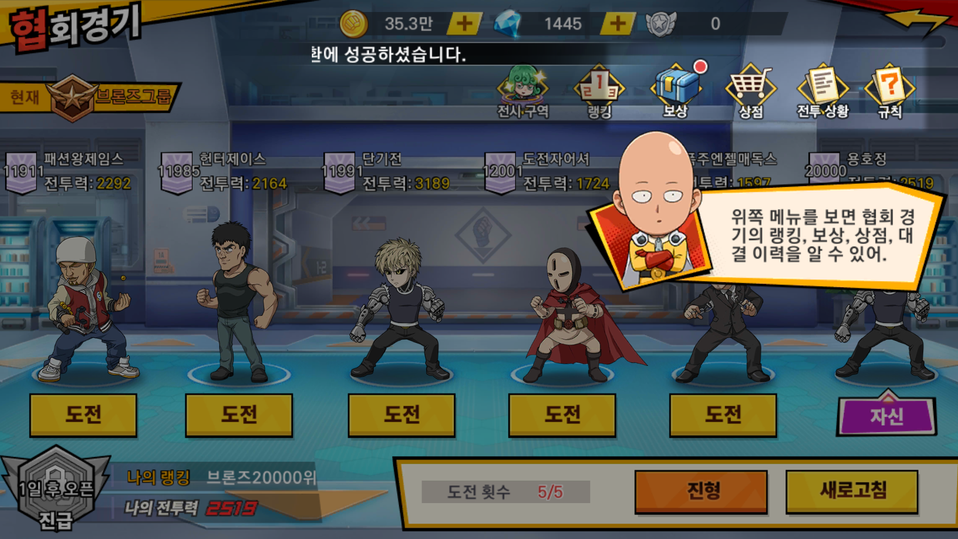 스토리를 진행하다 보면 협회 경기도 열리는데, 최대 랭킹 보상도 있는 것을 보니 확실히 많이 보던 게임 스타일에 IP만 원펀맨으로 만들었다는 느낌이 있습니다.