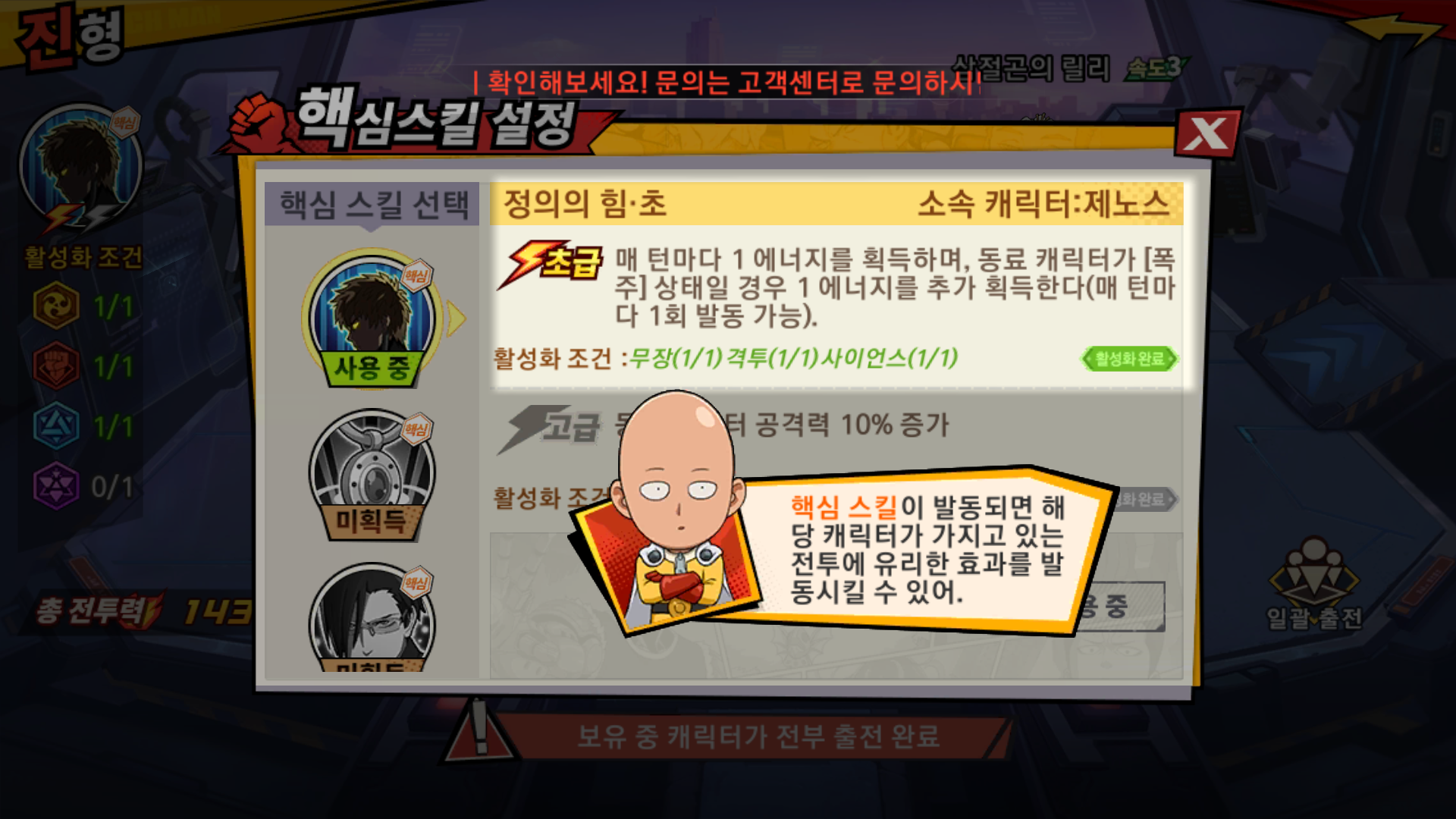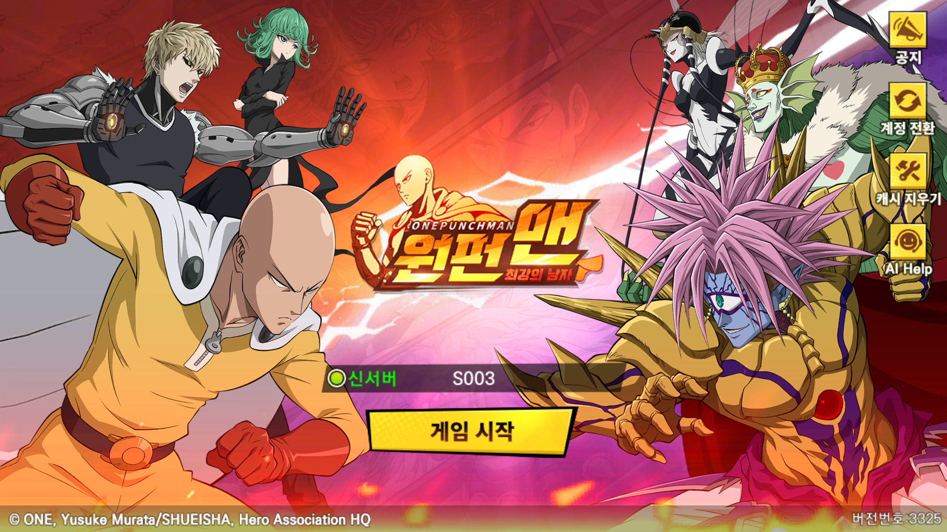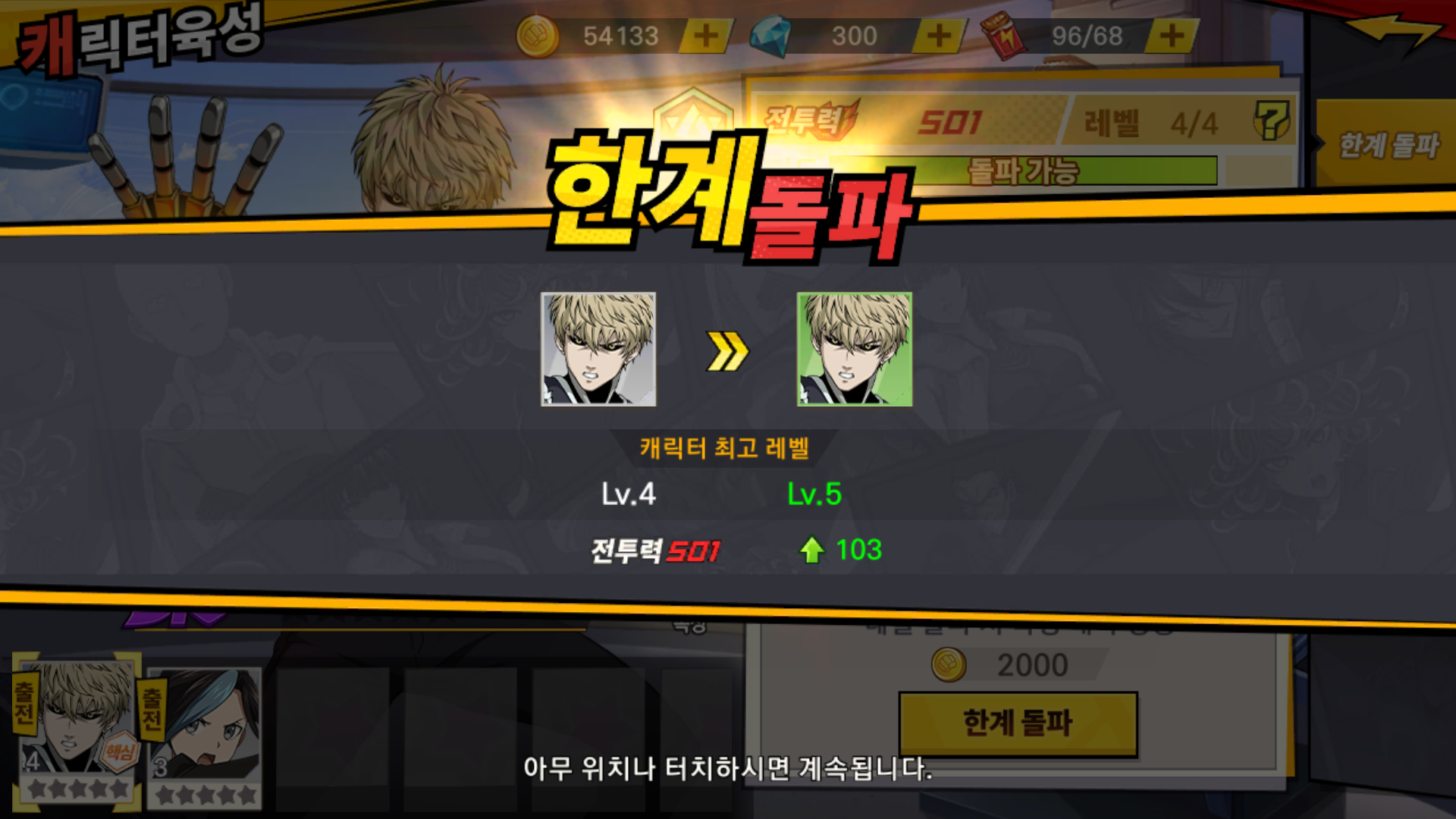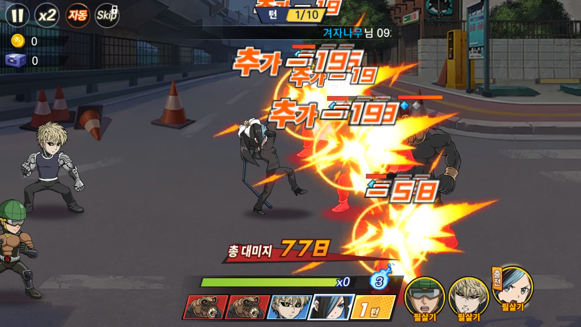 그런데 원펀맨에 등장하는 캐릭터로 싸운다는 거 빼면 전투가 그냥 많이 보던 중국산 게임 느낌이 너무 많이 납니다.