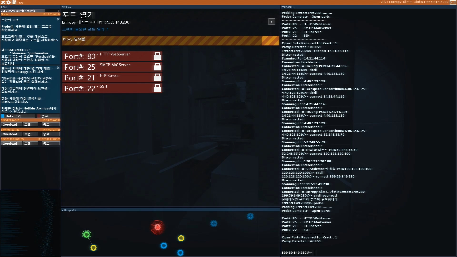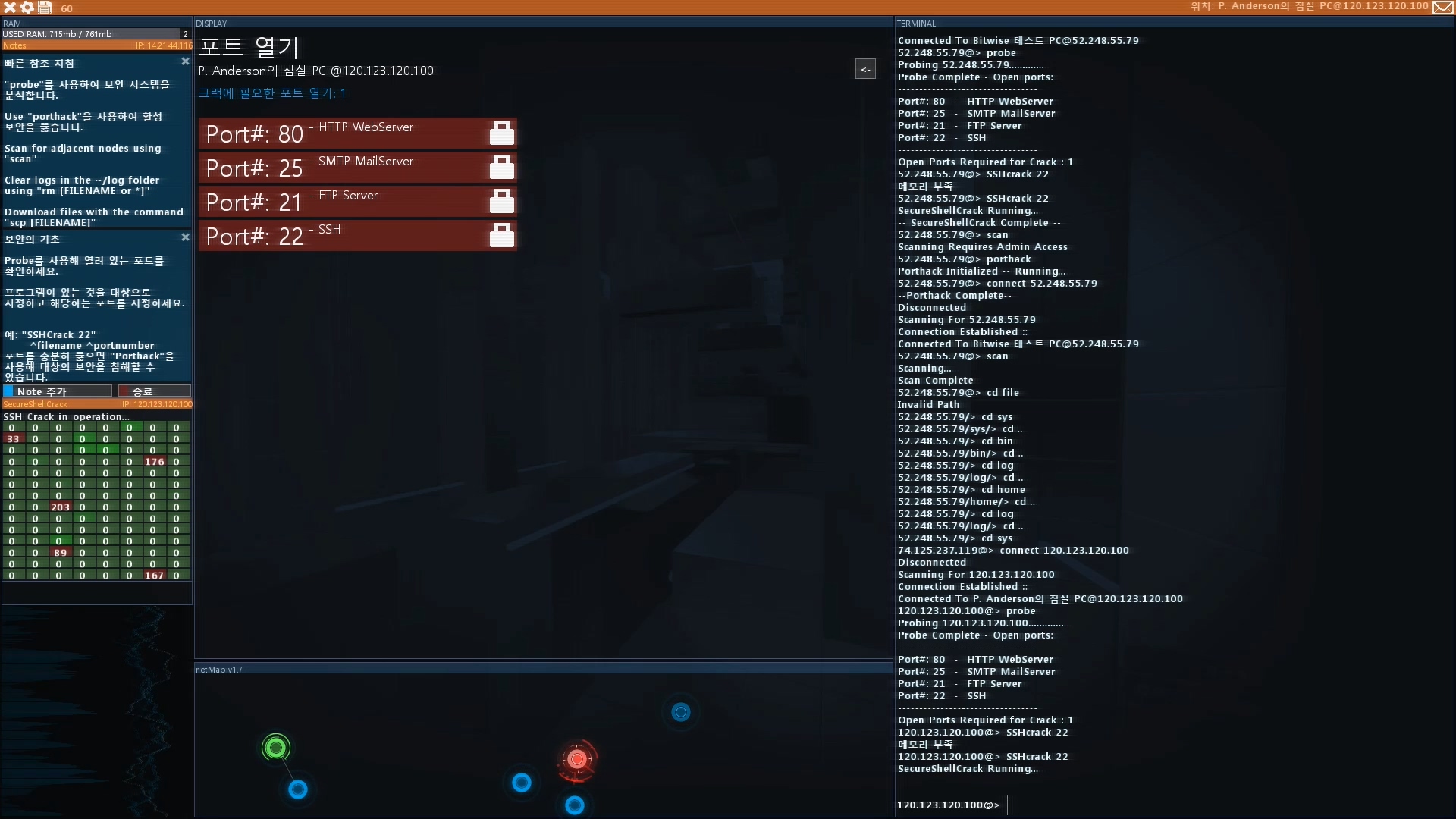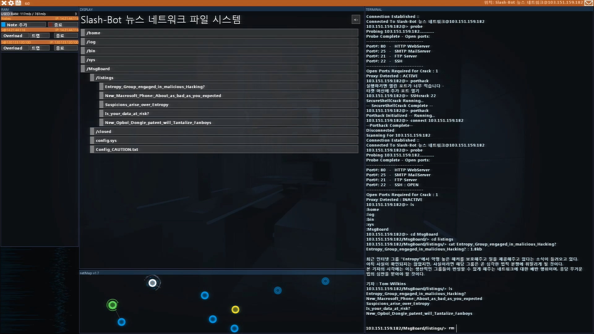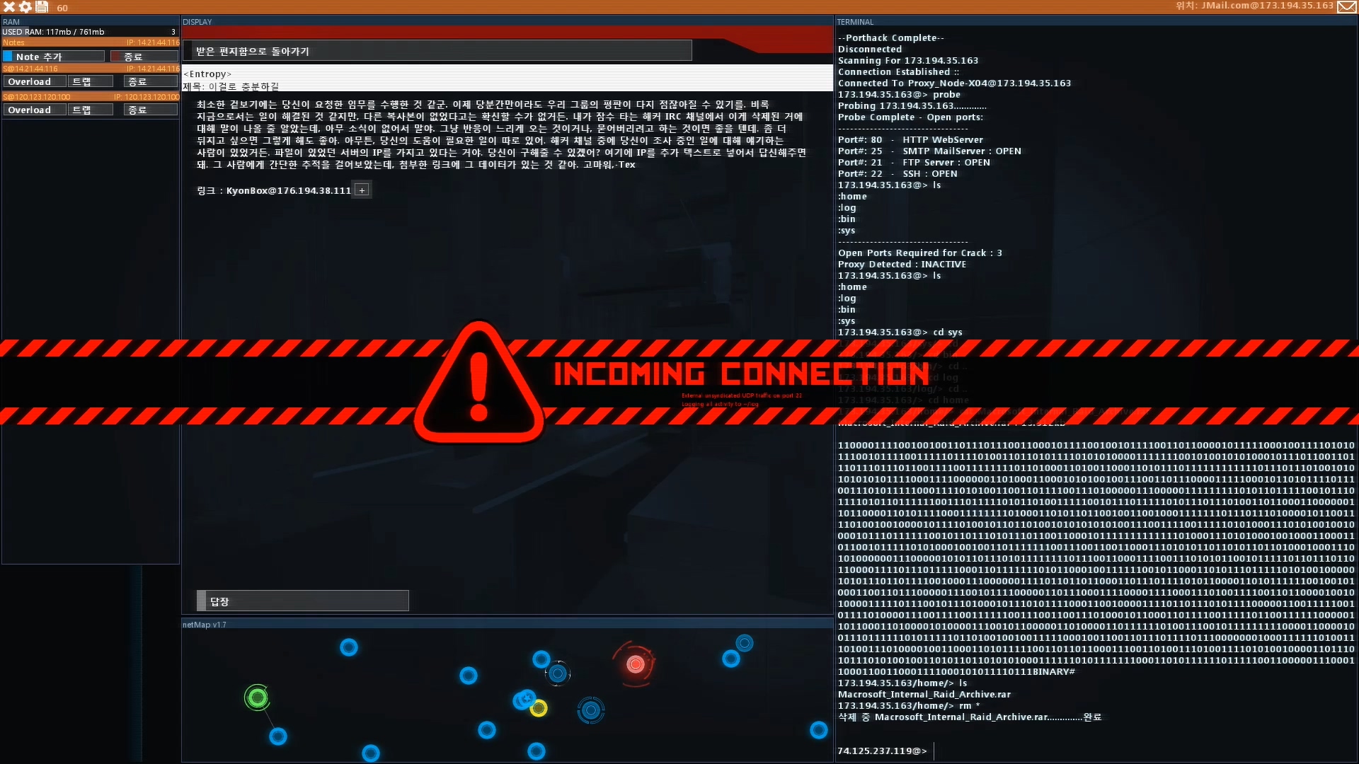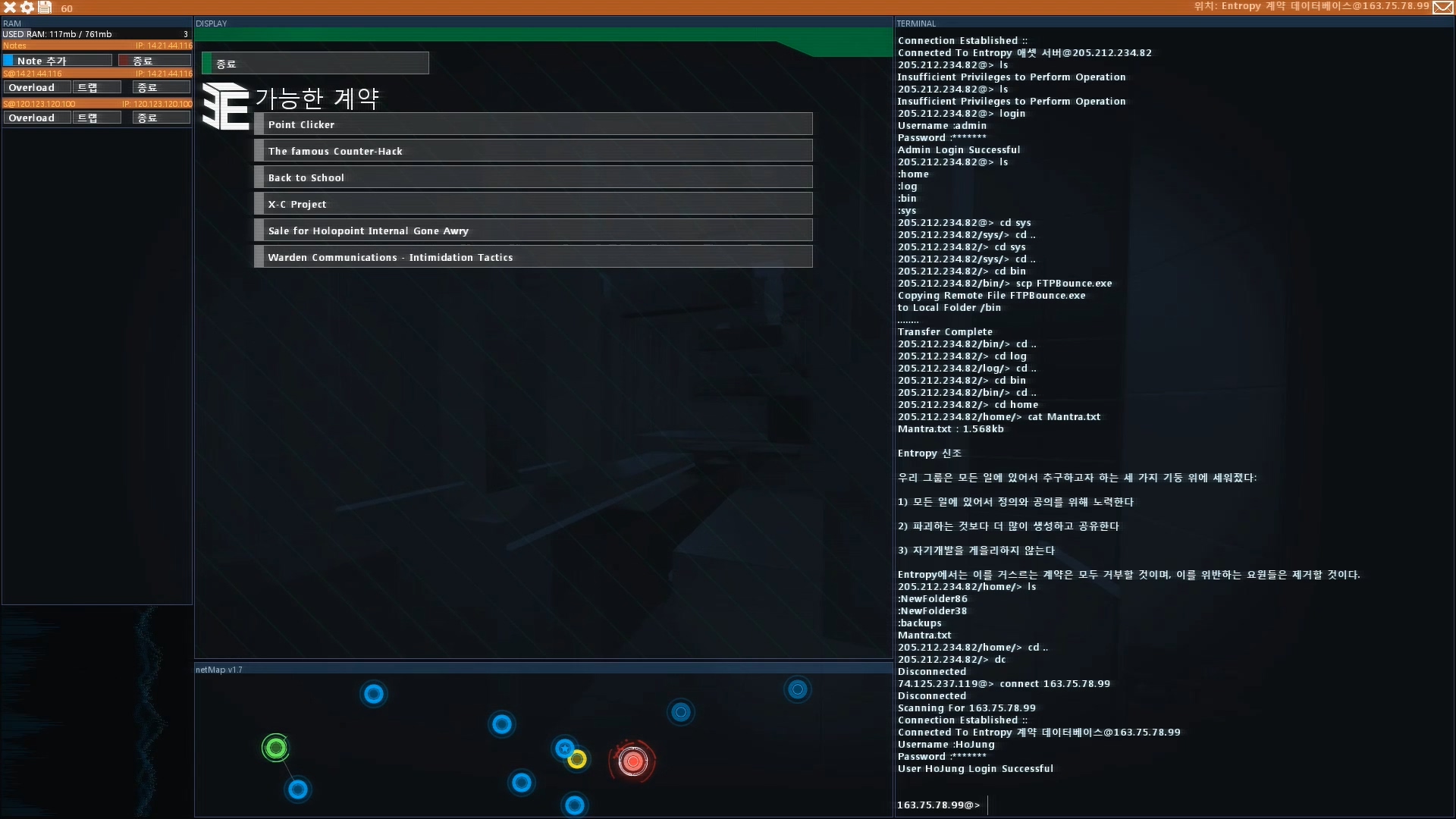 오늘 후기를 작성할 게임은 해커 시뮬레이션 게임 '핵넷'입니다. 스팀에서 10,500원으로 구매하실 수 있으며 자신이 마치 해커가 된 것처럼 명령 프롬프트 창을 통해 게임을 진행하며, 다른 컴퓨터에 접속하여 정보를 빼오거나 파일을 복사 또는 삭제시키는 임무들이 주어지는데 이에 따른 여러 상황들이 발생하는 등 상당히 잘 만들어진 게임입니다. 그러나 신선하고 독특한 진행방식이 무색하게 공식 한글화가 번역기보다 조금 나은 수준이라 무엇을 지시하는지 막힐 수 있어서 적극 추천드리기는 어려운 게임이네요.