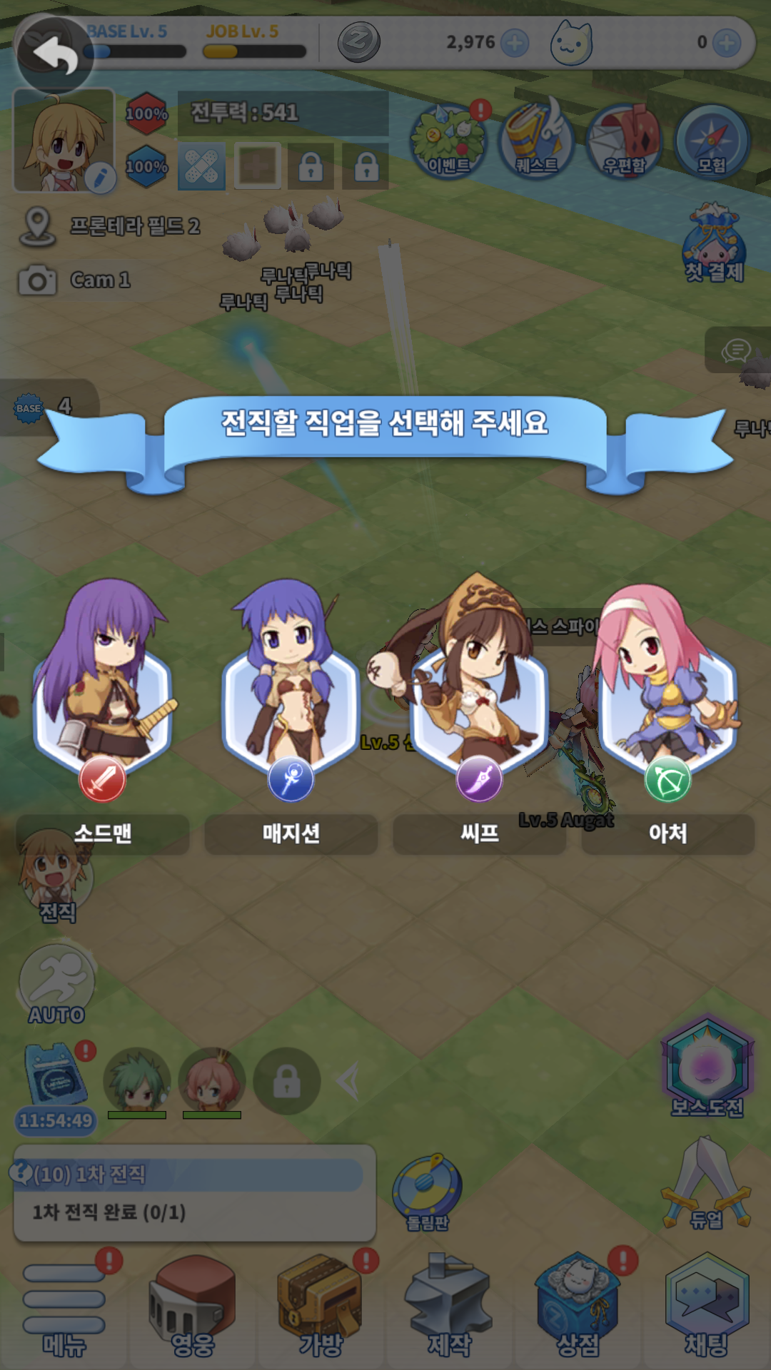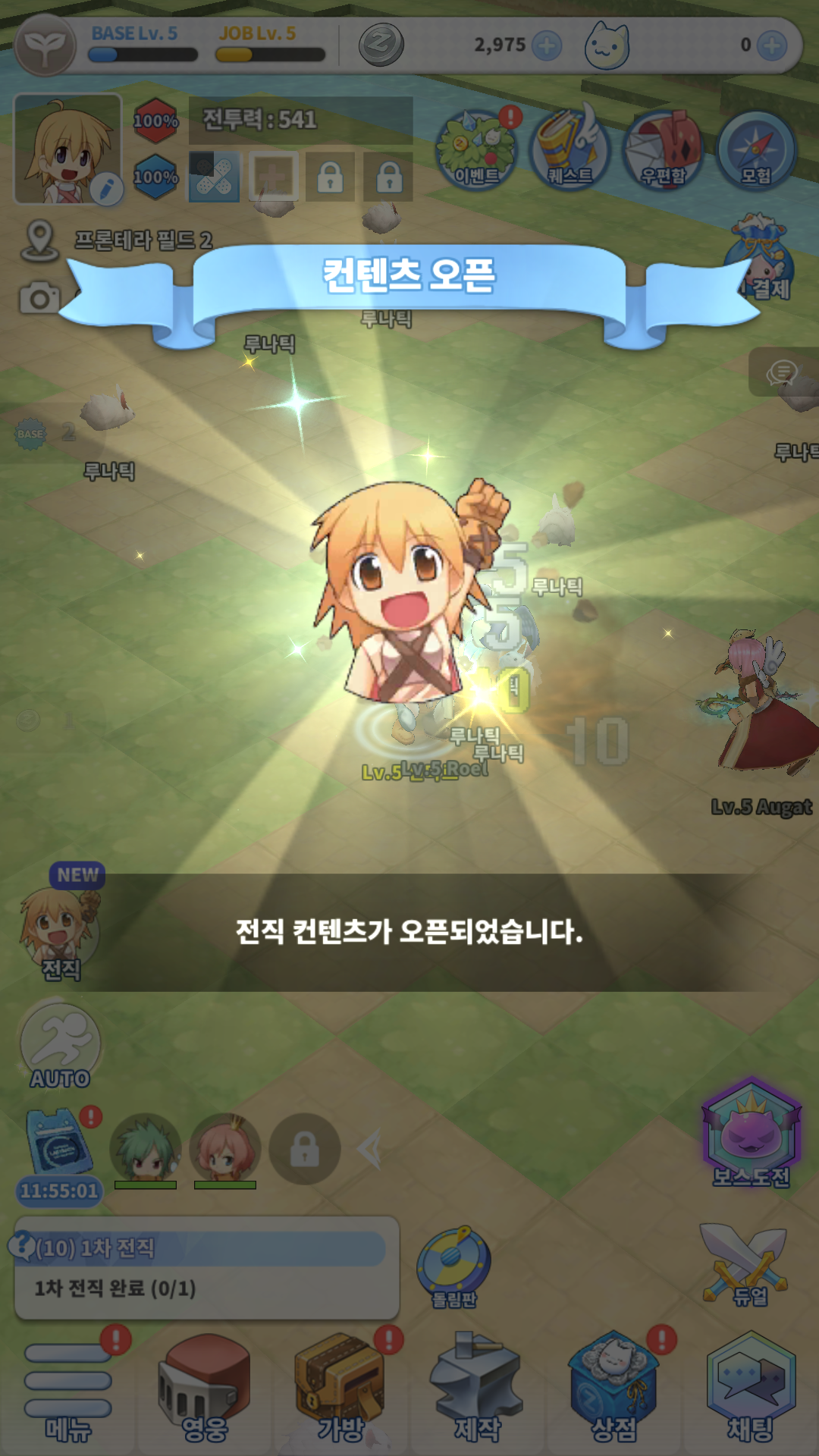 확실히 방치형이라 게임 속도가 빠릅니다. 플레이 한지 5분 만에 1차 전직을 하라고 하네요.