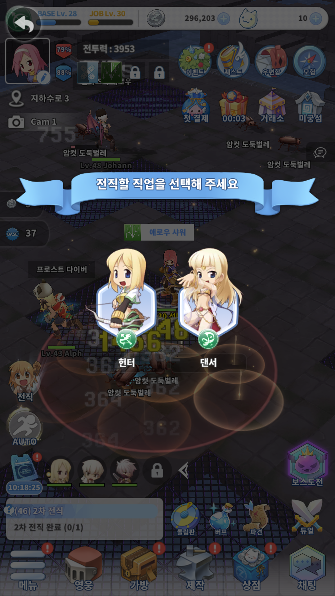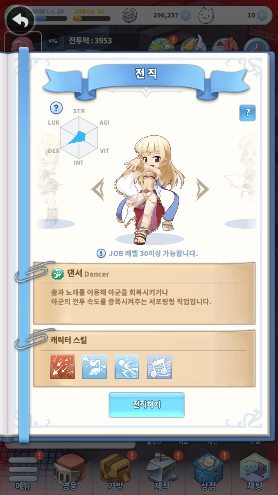 직업 레벨 30이 되자 2차 전직을 하라고 하길래 눌러봤는데 처음에는 헌터를 해야지 했다가 댄서가 서포터라고 해서 댄서로 전직을 했습니다.