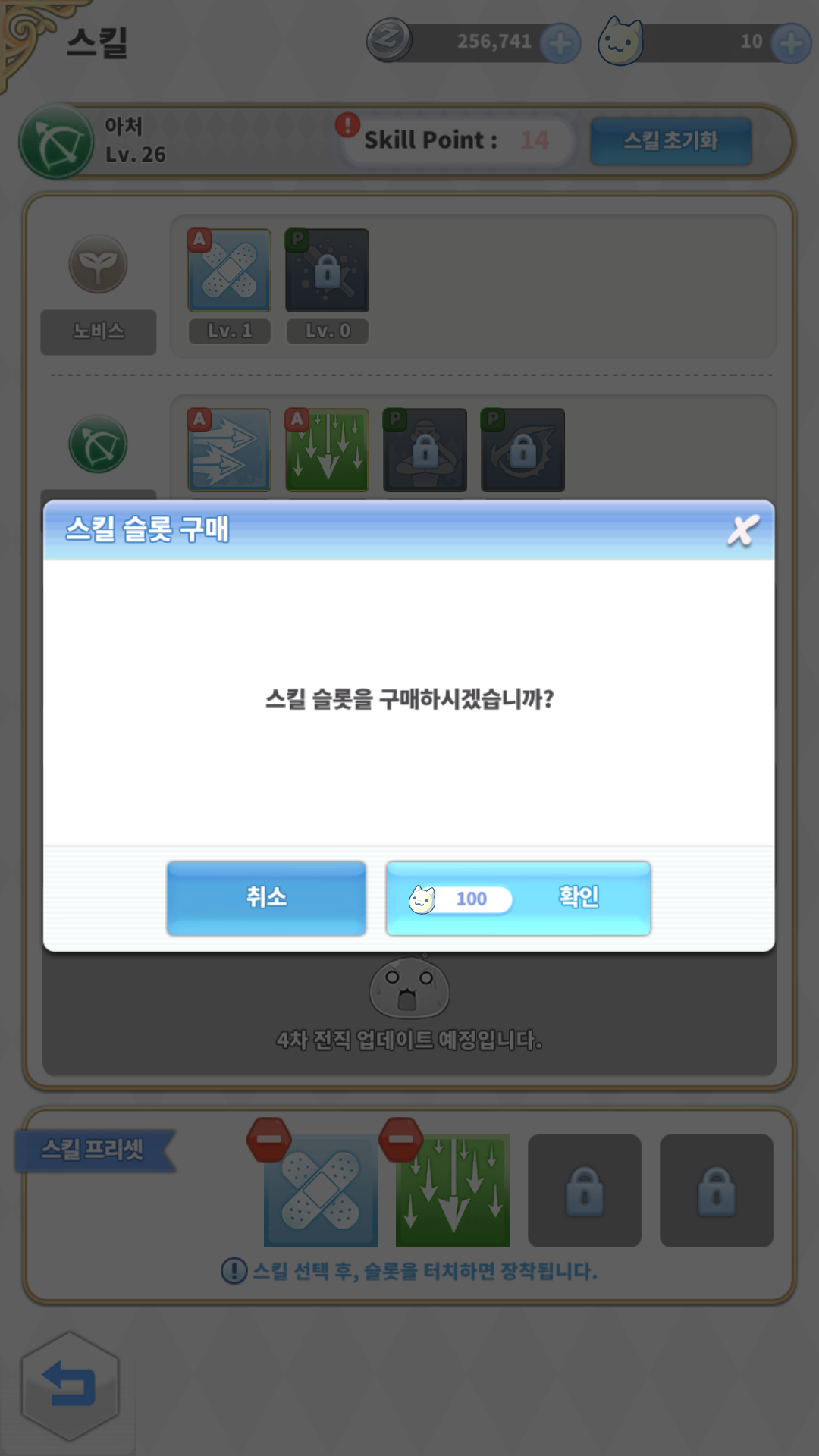 스킬 슬롯은 2개가 개방되어 있는데 3번째 슬롯을 열기 위해서는 특정 재화를 필요로 합니다.
