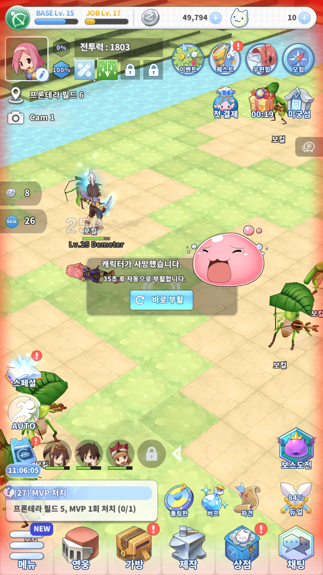캐릭터가 사망하면 이런 화면이 뜨는데 딱히 페널티는 없습니다. 방치하여 플레이할 경우 1분을 기다리면 자동 부활이 되고, 바로 부활을 눌러줘야 즉시 부활을 할 수 있네요.