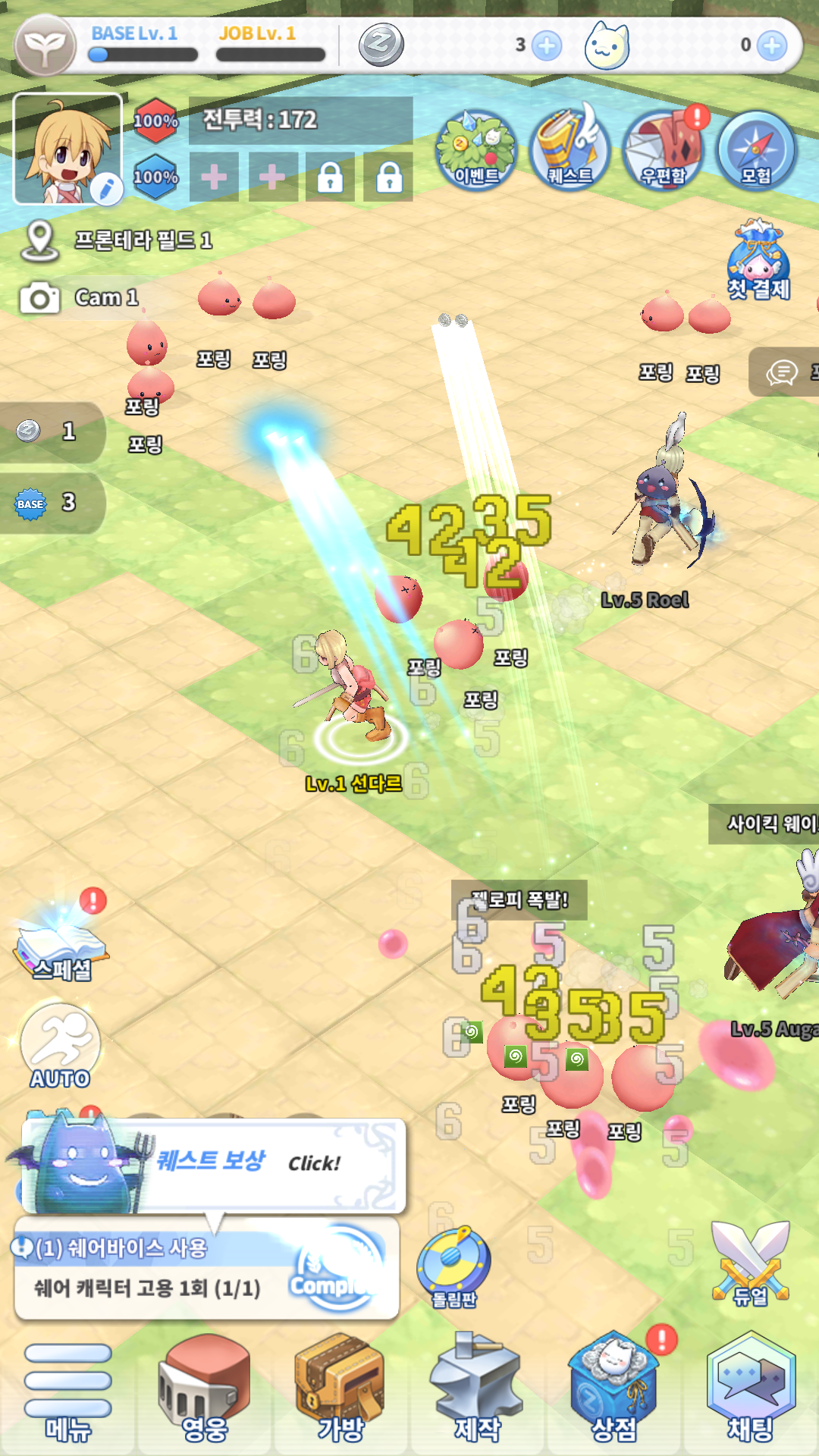 게임의 장점은 방치형답게 켜 두기만 해도 성장이 가능하며 게임에 큰 시간을 할애하지 않아도 됩니다. 물론 초반에는 사냥터를 자주 옮겨야 하기 때문에 손이 많이 가는 편이지만 중반만 돼도 그렇게 손이 많이 가지 않아요. 또, 쉐어 시스템으로 다른 캐릭터를 동료로 하여 사냥 속도까지 빠릅니다. 그러나 방치형이라 유저가 개입하는 부분이 상당히 적고, 개입하는 그 마저도 조작이 불편해서 딱히 흥미를 더 올려주지 않습니다. 그리고 고레벨 사냥터로 갈수록 장착한 장비에 비해 몬스터의 공격력이 강하고 다대일 전투를 하게 되다 보니 자주 죽게 되며, 차라리 죽고 바로 부활하는 게 더 나을 만큼 컨트롤을 한다고 해도 극복할 수 있는 요소가 아니네요.