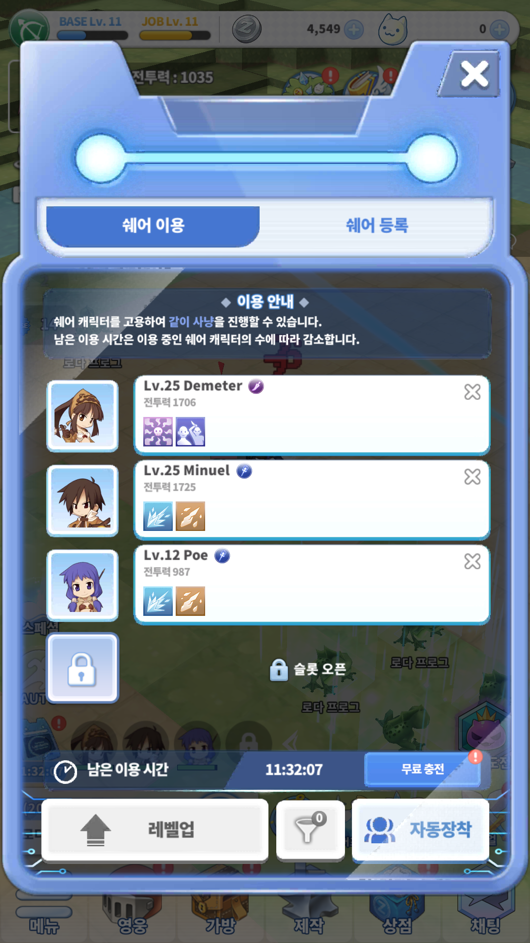 또 게임에서 쉐어 시스템이라는 게 있는데, 사냥을 할 때 도움을 주는 동료라고 생각하시면 편해요. 동료는 마음대로 바꿀 수 있으니 사냥터를 옮길 때마다 레벨이 높은 동료로 바꿔주는 게 좋습니다. 단, 쉐어 캐릭터를 여러 명 사용할수록 이용 시간도 빨리 줄어든다고 하니 참고하세요.