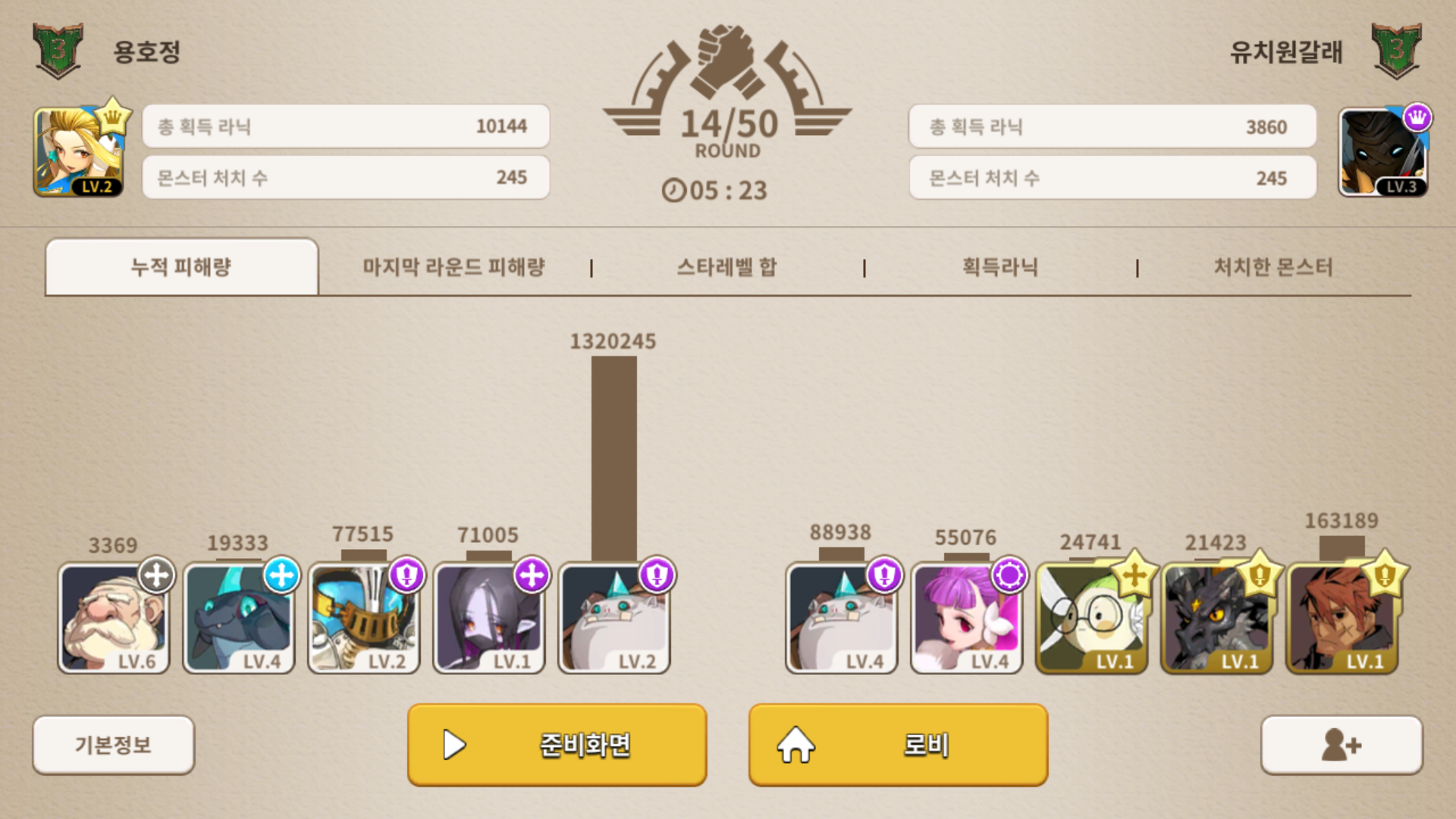 게임이 끝나면 상세 정보에서 자신이 넣은 딜량과 파트너가 넣은 딜량도 볼 수 있습니다. 총 획득 라닉에서 라닉은 몬스터를 소환하는데 필요한 재화로, 성장형을 많이 사용할수록 더 많이 얻을 수 있어요.