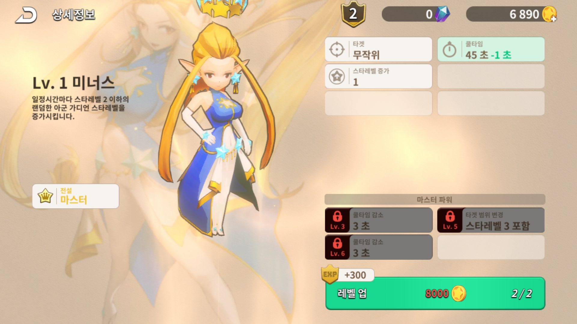 미너스의 능력이 '일정 시간마다 스타 레벨 2 이하의 랜덤한 아군 가디언 스타 레벨 증가'인데 쓸만하네요.