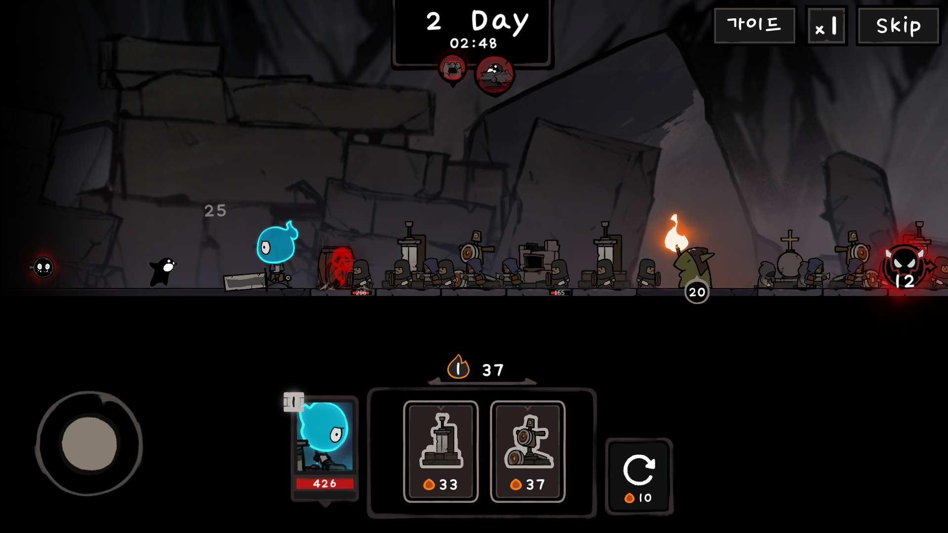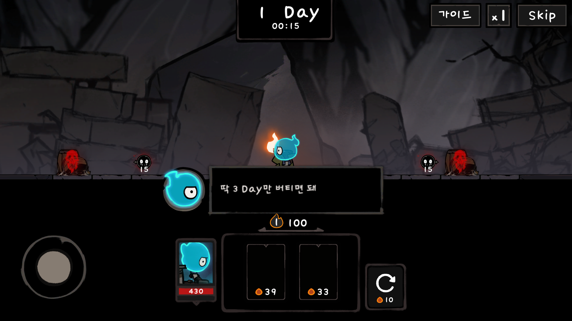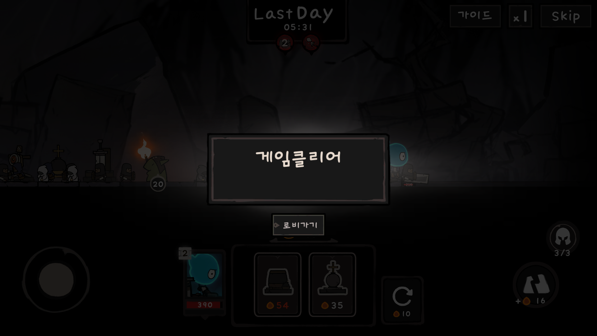 그런데 본 게임을 시작해보니 타워에 뭐 이상한 표시도 뜨면서 영웅으로 해제를 해줘야 하는 상황이 발생했는데 처음에는 뭔지 모르고 해골 표시가 뜨길래 타워가 부서져서 철거하라는 건가 생각했을 정도로 게임이 불친절해요. 또, 3일만 버티면 되는 줄 알았는데 4일까지 가는걸 보니 3일은 튜토리얼 한정이었나 봐요.