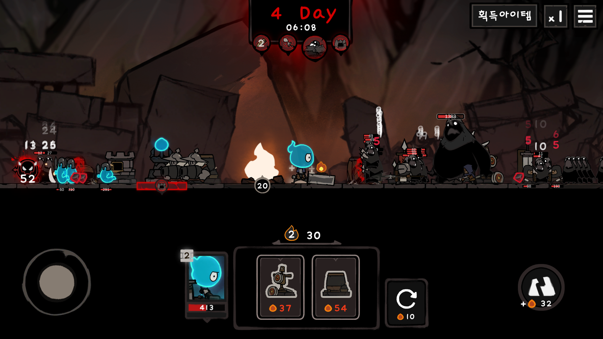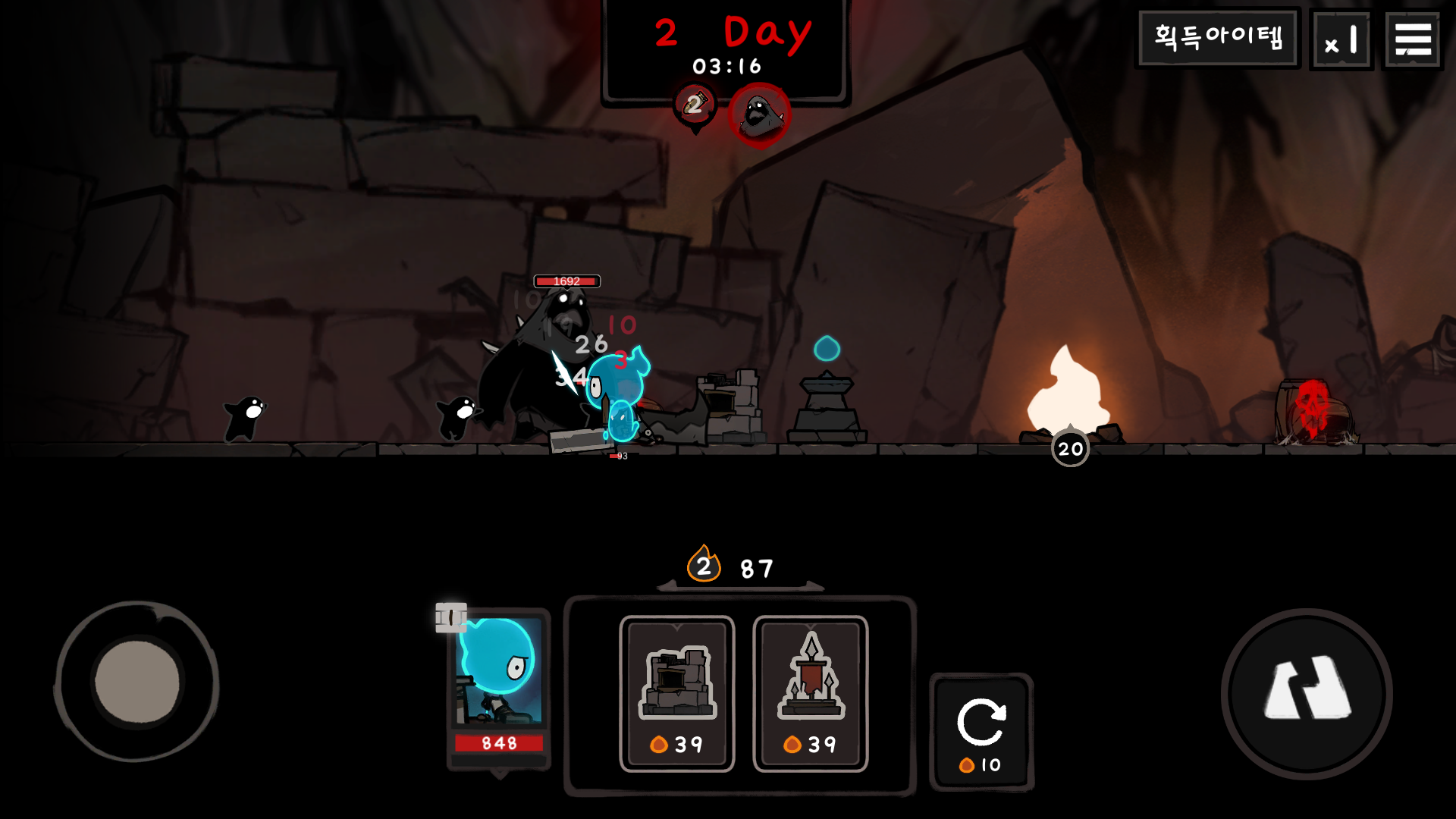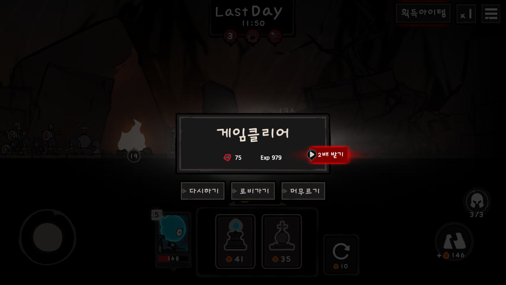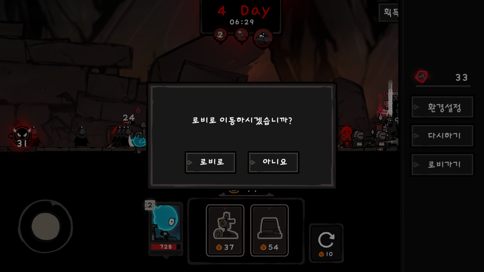 그런데 본 게임을 시작해보니 타워에 뭐 이상한 표시도 뜨면서 영웅으로 해제를 해줘야 하는 상황이 발생했는데 처음에는 뭔지 모르고 해골 표시가 뜨길래 타워가 부서져서 철거하라는 건가 생각했을 정도로 게임이 불친절해요. 또, 3일만 버티면 되는 줄 알았는데 4일까지 가는걸 보니 3일은 튜토리얼 한정이었나 봐요.