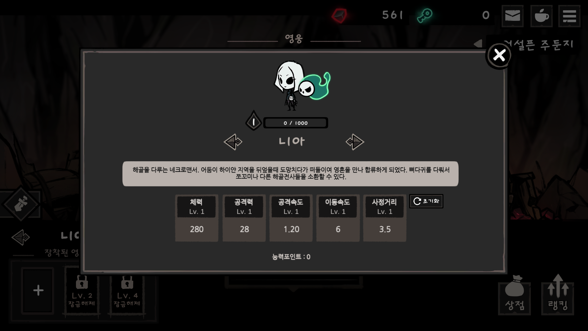 포인트가 생겨서 저는 공격력에 투자를 했는데 여기서도 업그레이드 수치가 안 나오는 게 아쉽습니다. 초기화에는 150개의 영혼석을 필요로 해서 미리 수치를 알 수 있으면 좋을 것 같아요.