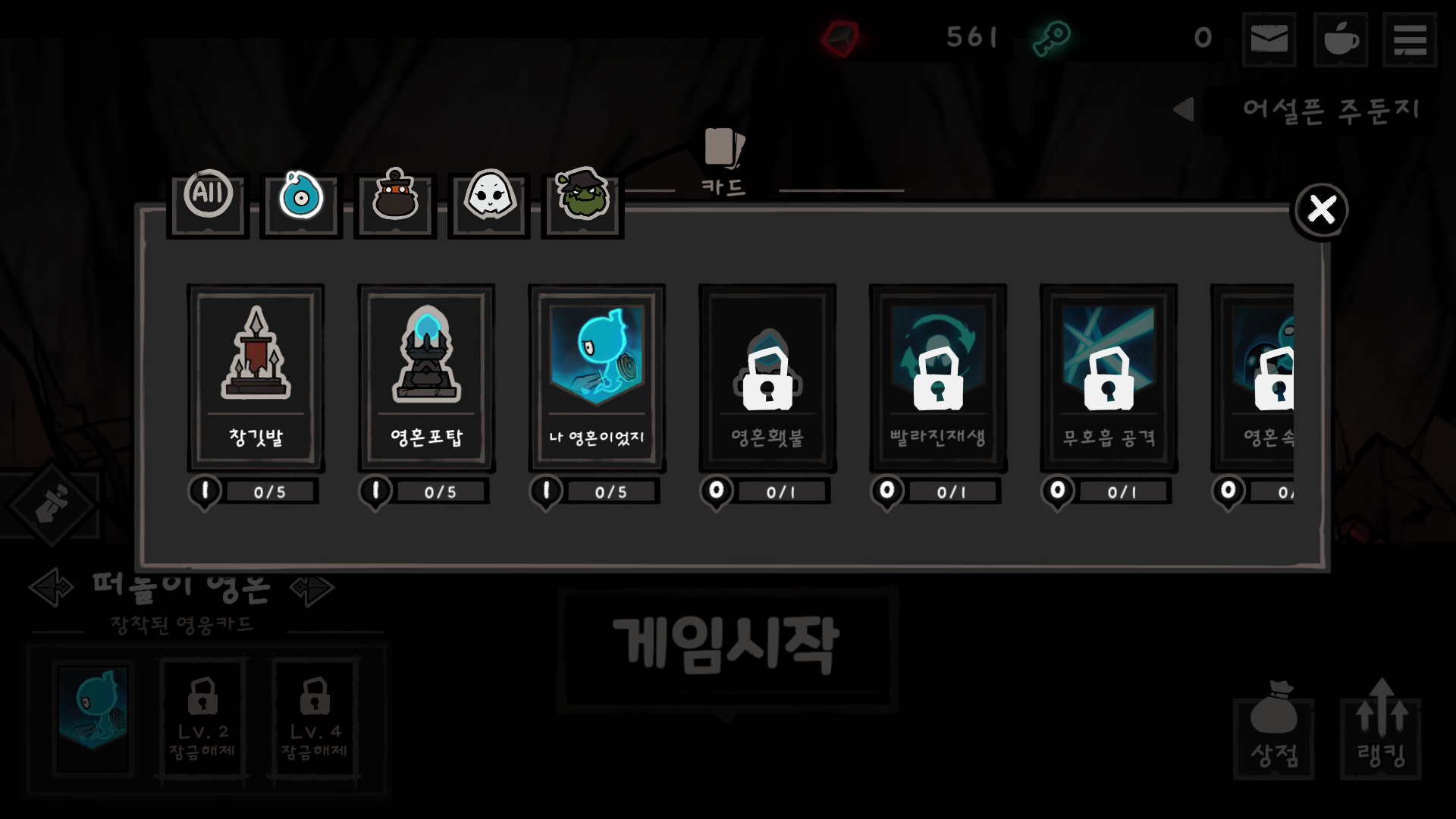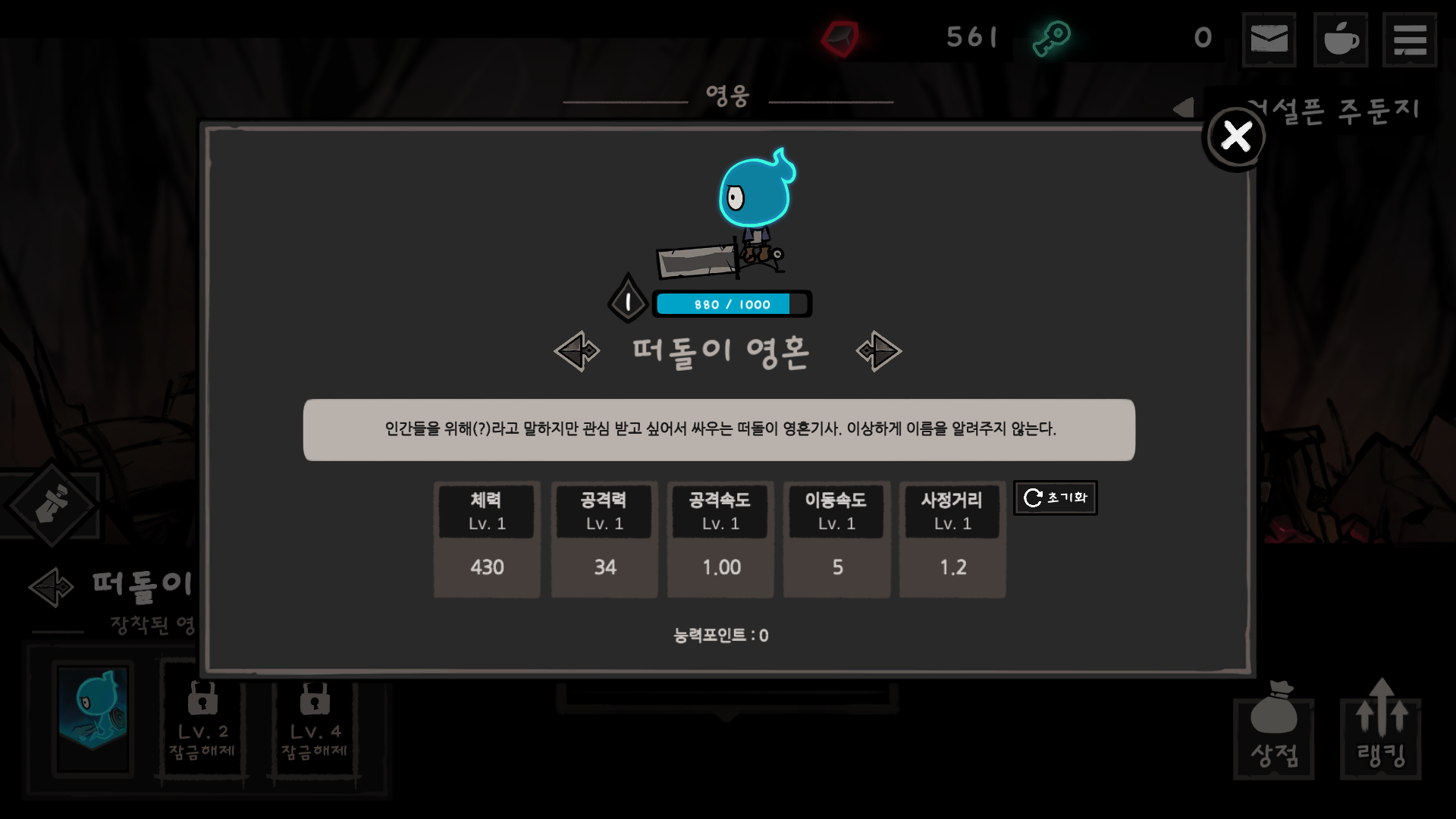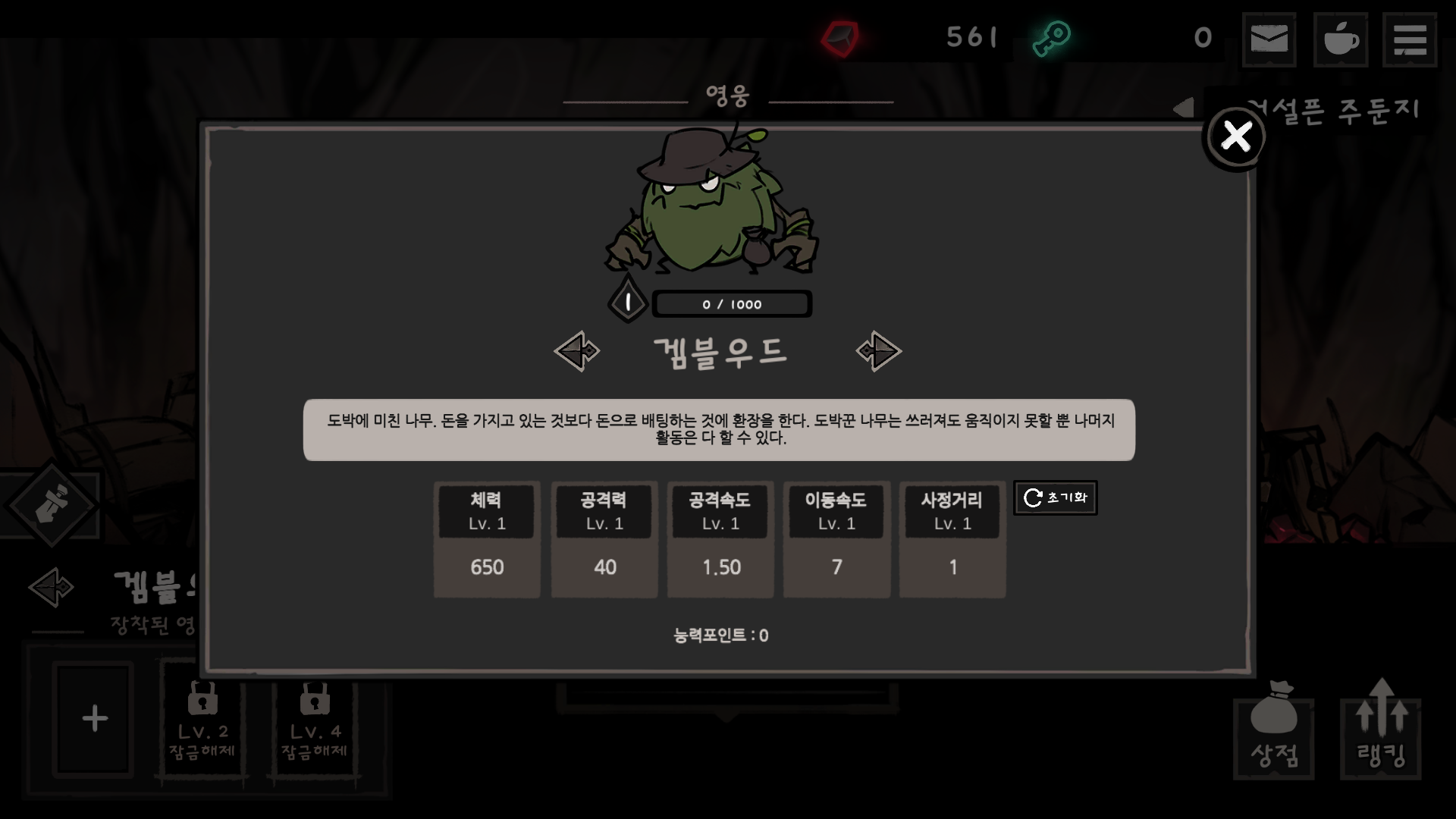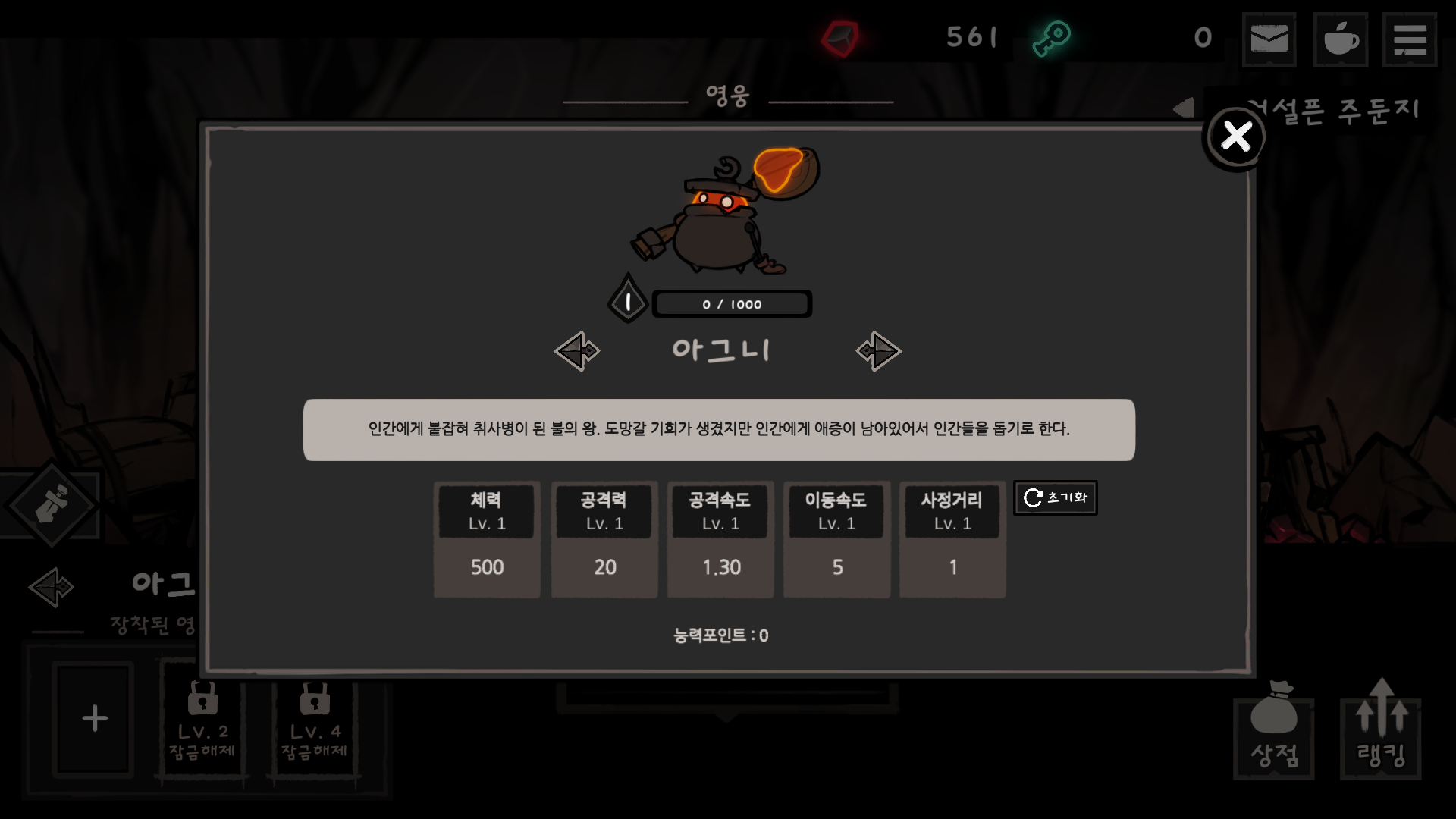 게임에 영웅도 고를 수 있는데, 우선 기본으로 4명의 영웅을 줍니다. 경험치가 오르고 아래 능력 포인트가 있는 것을 보니 사용하면 사용할수록 포인트를 얻어서 강화도 할 수 있나 봐요. 경험치가 클리어를 해야만 주는 게 아니라 그냥 플레이를 하면 주기 때문에 누적 플레이로 강화를 하고 깨는 방법도 있겠네요.