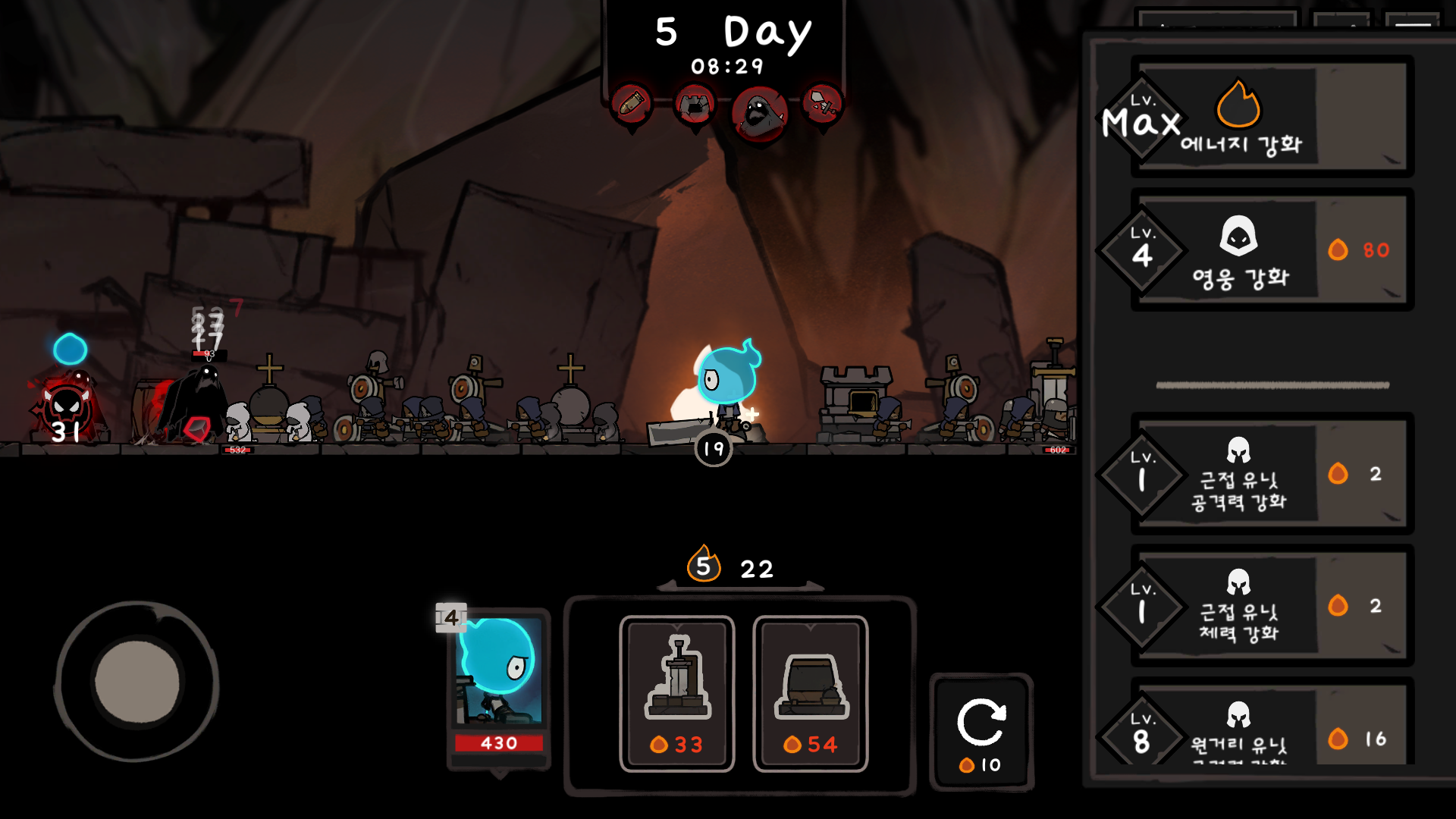 또 아쉬운 부분은 영웅도 그렇고 배치하는 유닛도 그렇고 타격감이 너무 없어요. 타워를 한번 설치하면 방치해두고 라운드를 진행하는 방식이 아니라 난이도가 꽤 높게 설정되어 있어서 꾸준히 영웅도 활용하고 바쁘게 움직이며 전투를 하게 되는데, 타격감이 없다 보니 재미가 반감되는 부분이 있습니다.