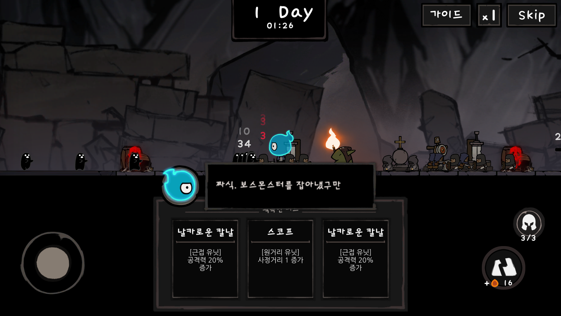 그리고 하루에 한 번씩 보스가 등장하는데, 보스를 잡으면 랜덤 하게 등장하는 3개의 버프 중 하나를 골라 선택할 수 있습니다. 여기서 아쉬운 부분은 겨우 3가지가 나오는데 중복이 나온다는 부분이에요.