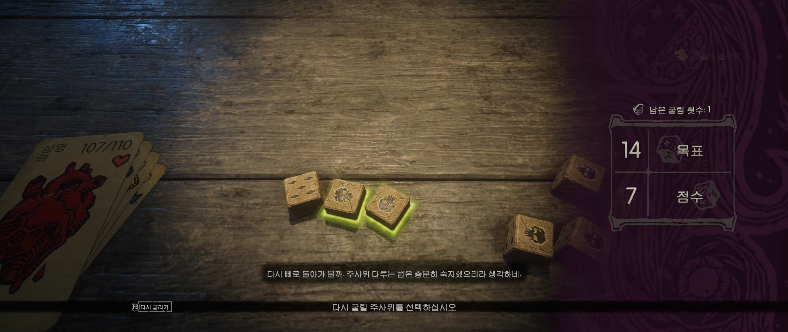 주사위를 굴리는 건 기회가 두 번 주어지는데, 한번 굴리고 나서 원하는 주사위만 선택해서 다시 굴릴 수 있습니다.
