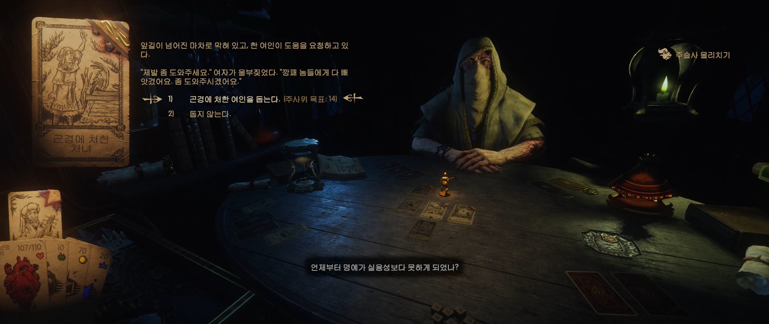 전투를 마치면 다시 테이블로 복귀를 하고, 이야기를 진행하게 되며 지금은 주사위를 굴리는 이벤트가 걸렸는데, 주사위 3개로 14 이상 나와야 하니 꽤 높네요.
