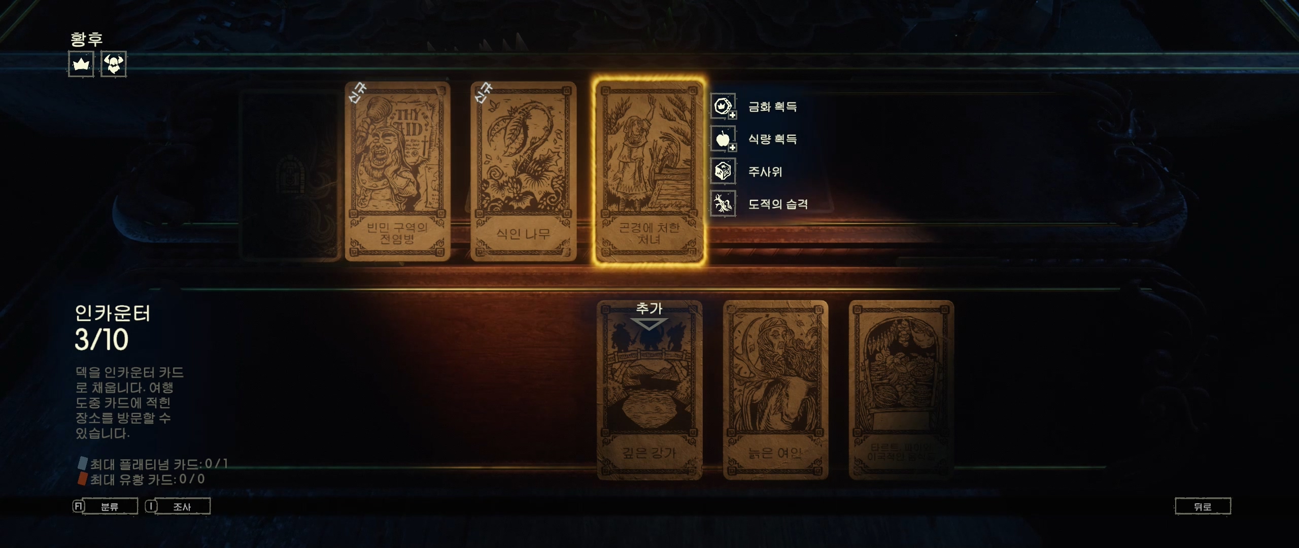 이건 인카운터 카드로, 게임 진행 시 발생하는 이벤트를 고르는 건데 골랐다고 무조건 다 나오지는 않고, 저 중에서 나올 수 있습니다. 옆에는 카드의 효과가 표시되어 있으니 원하는 것 위주로 넣으시면 됩니다.