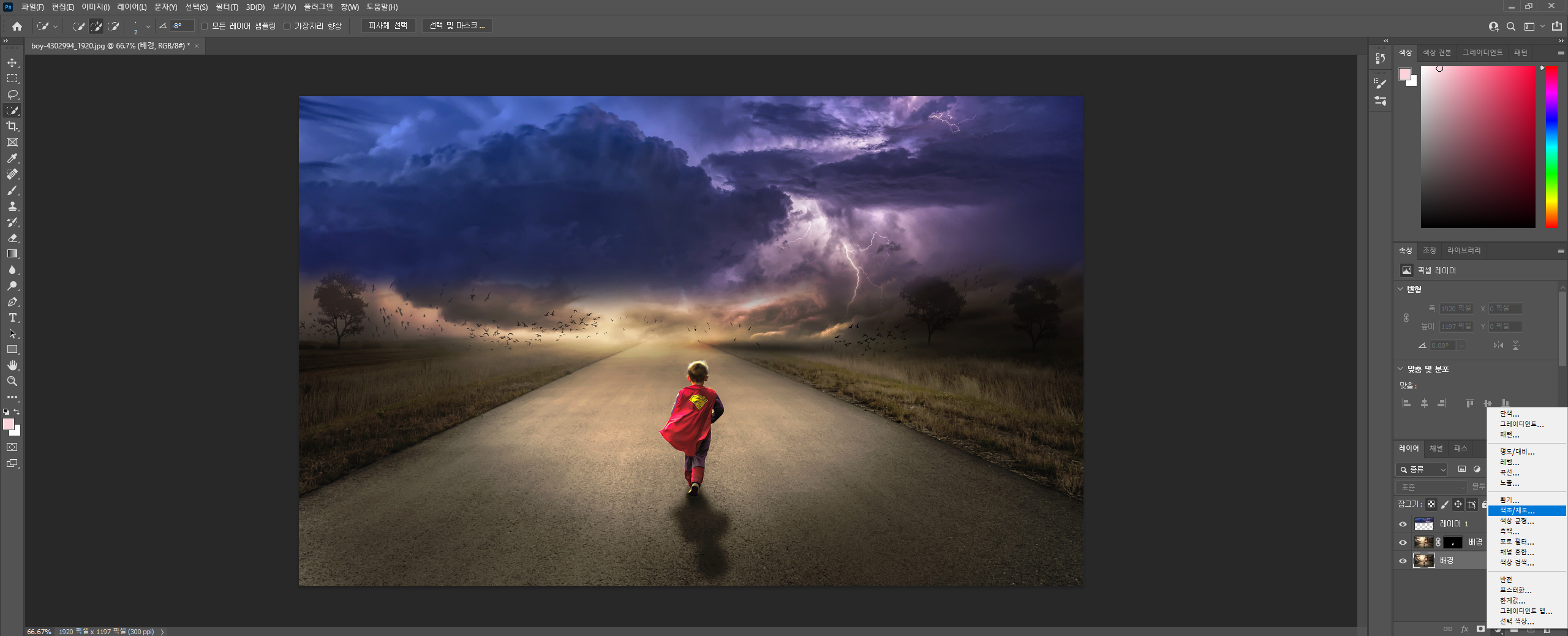 이번에는 구름이 아닌 배경 레이어에서 조정 레이어를 선택 후 색조/채도를 선택해줍니다.