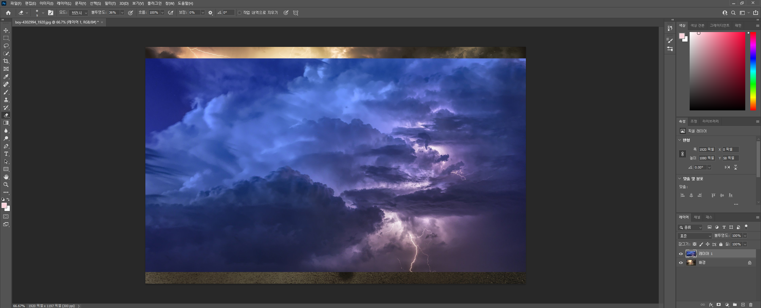 지우개 툴(단축키 E)을 이용하여 경계선을 지워줍니다. 이때 지우개는 부드러운 원을 하시고, 크기는 크게 해서 지워줘야 자연스럽게 지워집니다. 불투명도를 내려서 작업하면 더 섬세하게 조절할 수 있습니다.