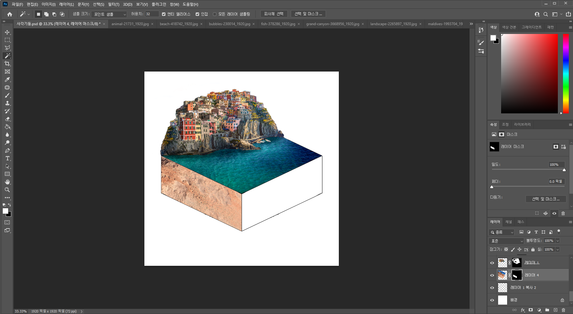 조정 레이어 - 색조/채도를 선택하여 색상화 체크 후 색을 비슷하게 맞춰주고, 바다에서 멀어질수록 깊어지게 지워줍니다. 그리고 바닷속이 될 사진도 불러와서 색상을 맞춰주고 땅이 지워진 부분에서 나타나게 깔아주세요.